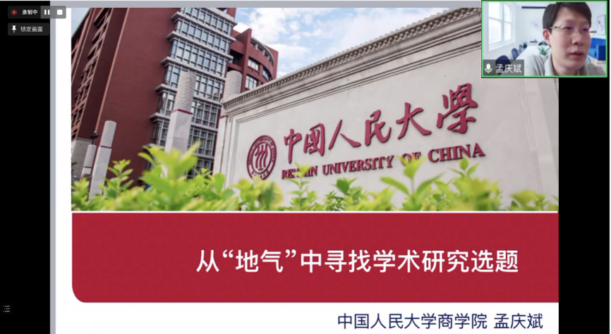 5月20日,北京语言大学商学院“双周学术论坛”系列活动第十场如期举行。本次论坛邀请到了中国人民大学商学院财务金融系教授孟庆斌老师,作题为“从‘地气’中寻找学术研究选题”的线上专题讲座。讲座之余,孟老师为同学们细心解答关于选题存在的困惑。此次参与线上论坛的人数约有80余人次,同学们在线积极提问,孟老师作出耐心解答,论坛学术交流氛围浓厚,与会师生受益匪浅。