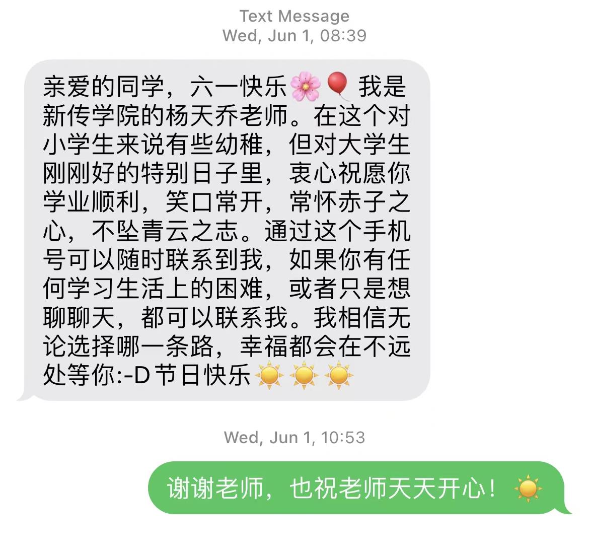 4月至今学院在校学生人数一直保持在28人左右,学生辅导员王一琳老师始终在校陪伴同学,党总支副书记杨天乔于5月28日入校工作至今。云国强院长、郭之恩副院长在校外通过各种渠道关心、慰问在校同学。学院设定了“互动不分时、关心不停摆”的工作要求,在云国强院长的倡导下,全院教师通过网络课堂、课下辅导等方式,慰问关心同学。学院拿出专门经费,于5月4日当天举办学生座谈会,听取同学们的实际困难、为大家加油鼓劲。6月1日当天,学院为在校学生购置了“六一大礼包”,表达了学院老师们对于同学的牵挂。杨天乔老师当天为在校所有学生发送了问候短信,同学们也进行了热情、真诚的回复。这一系列举措,形成了“师生互动、保障有力”的良好氛围,真真切切做到了“暖心”。