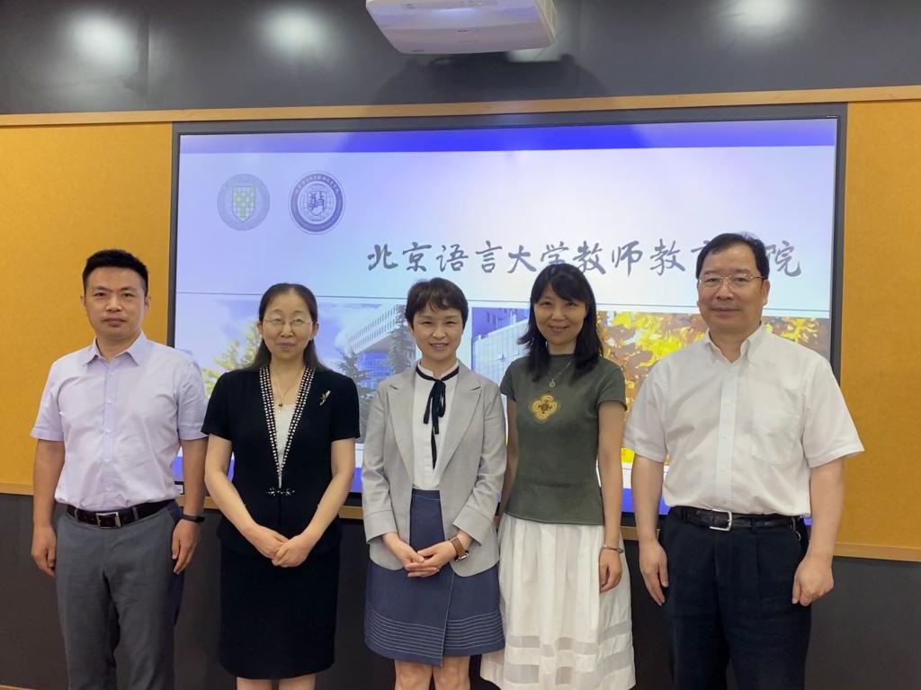 2022年8月9日上午9时,上海大学国际教育学院院长李颖洁教授、副院长裴雨来教授等一行到访北京语言大学教师教育学院。教师教育学院党委书记程娟教授、院长兼党委副书记施家炜教授参加座谈,汉语国际教育研究院院长吴应辉教授应邀参加交流。