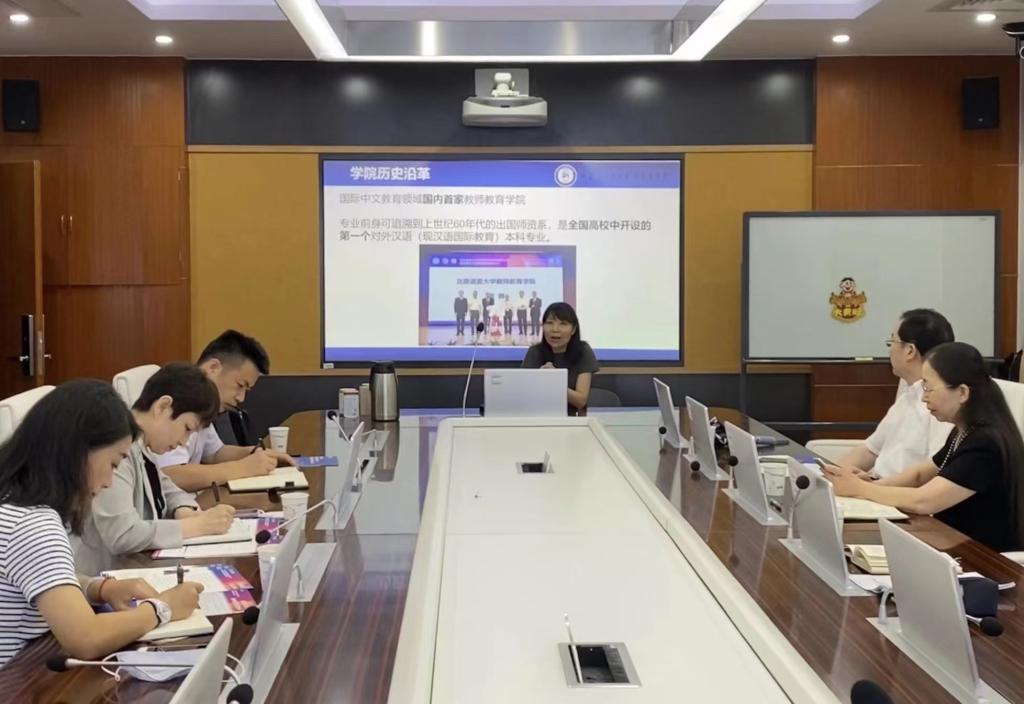 李颖洁院长介绍了上海大学国际教育学院的发展历程与建设现状,提出了汉语国际教育专业建设和学科发展在现阶段的重点和所面临的痛点,希望向北语学习成功经验,共谋发展。双方对此进行了深入的分享和交流。在交流中,双方提到文科专业和理工科专业的不同特点,指出应保持合理规范的学科评价体系;从学科专家团队、学术刊物、学术论坛三方面入手,不断扩大汉语国际教育专业的知名度和影响力;同时,应加强学科高精尖人才培养,中国学生和国际学生人才一体化、专业化培养,进一步提升学科专业服务国家战略的能力。