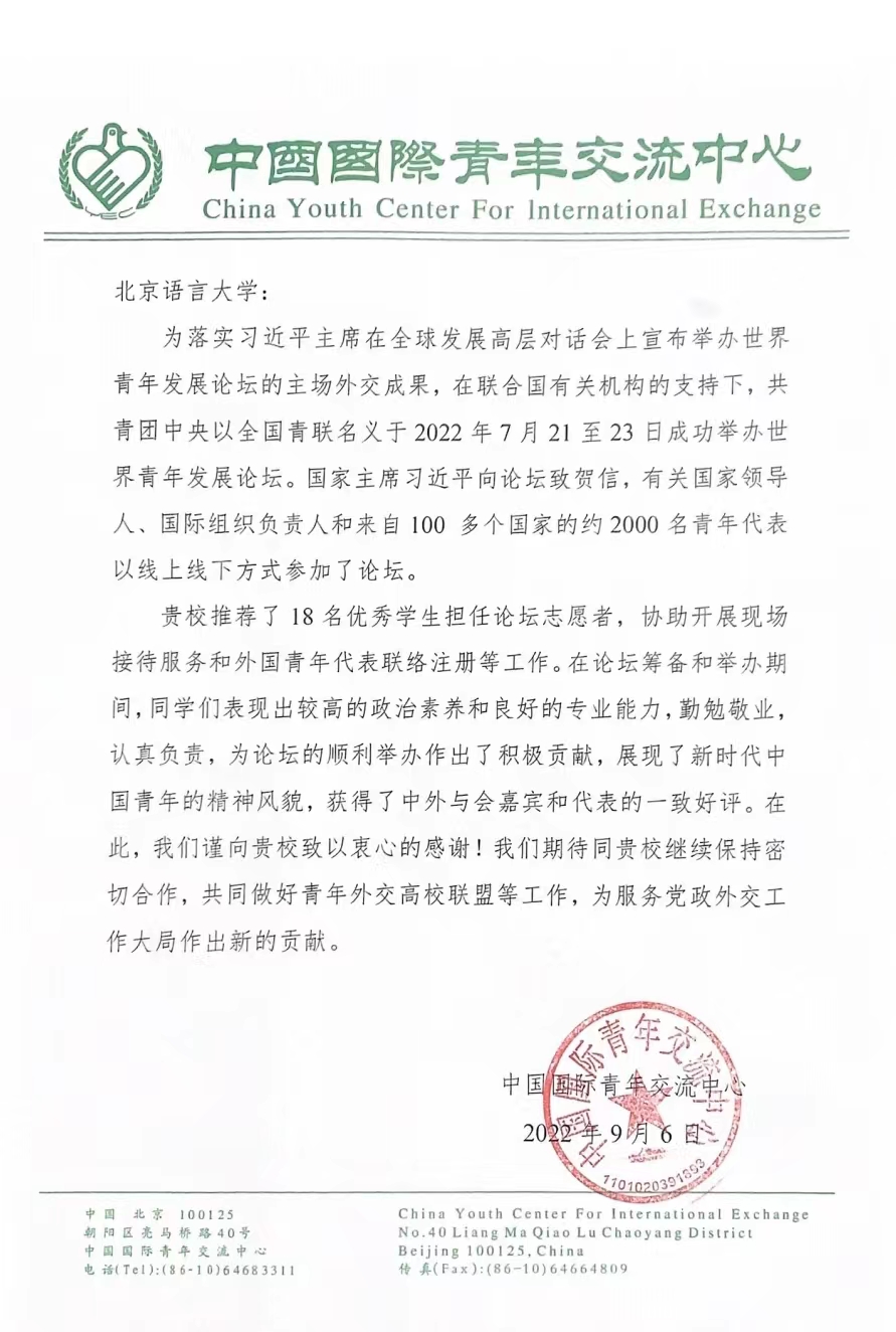 信中提到,在此次青年发展论坛中,来自北语的18位志愿者充分展现了他们积极向上的精神面貌和良好的专业素养。在论坛筹备和举办期间,他们一直保持着认真负责的态度,以最饱满的热情投入到各项工作中,协助开展了现场接待服务和外国青年代表联络注册等。面对来自五湖四海的宾客,北语志愿者们以真诚相待,向来宾们展现了新时代中国青年的风采,获得了中外与会嘉宾的一致好评。在此次论坛中,北语志愿者们充分发挥了志愿者精神,为论坛的成功举办做出了积极贡献!