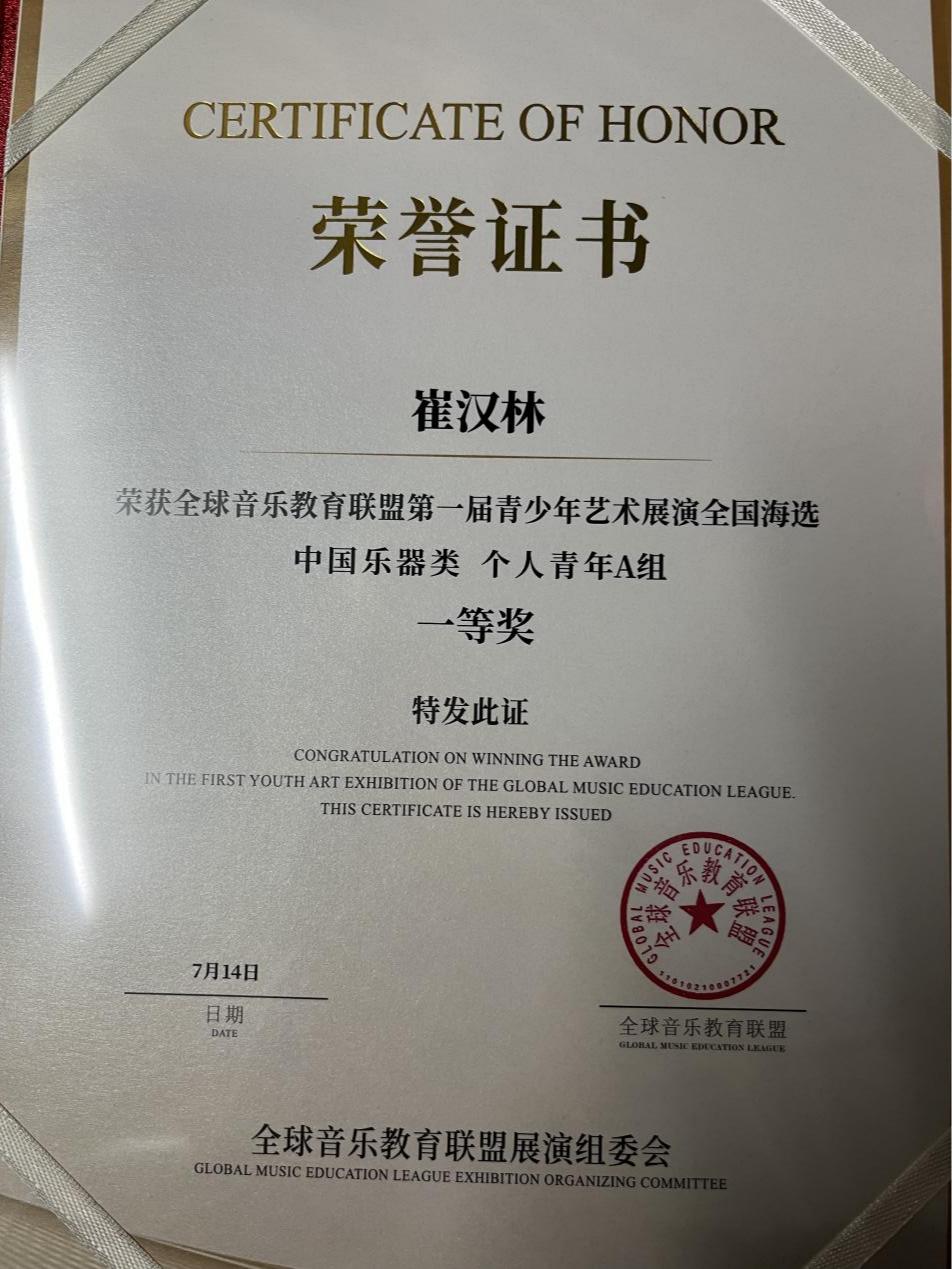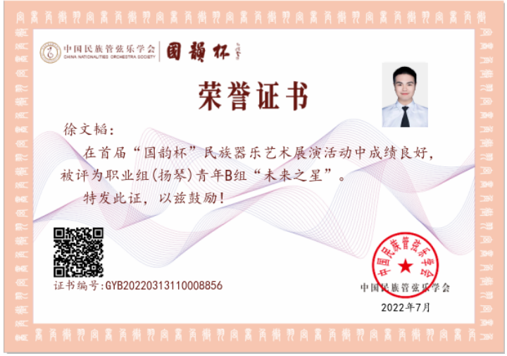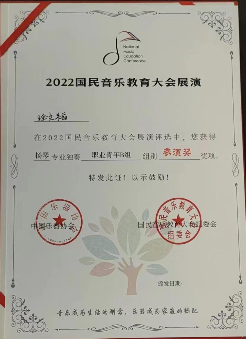 2021级扬琴专业学生徐文韬荣获“首届国韵杯民族器乐艺术展演”职业组(扬琴)青年B组未来之星;荣获“首届国民音乐教育大会展演”职业青年B组参演奖。张侠老师荣获“优秀辅导教师”奖。