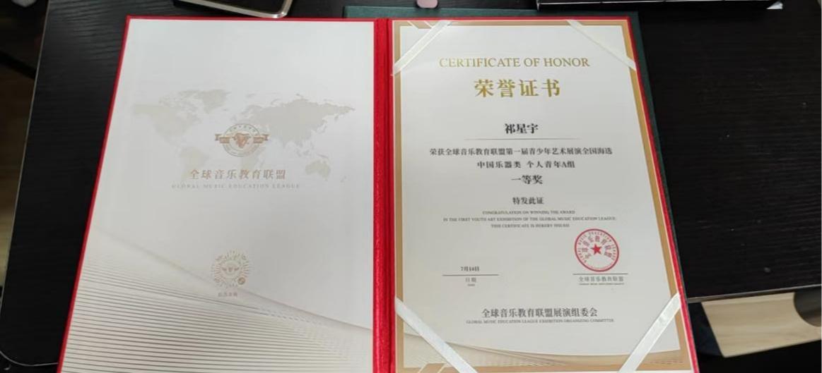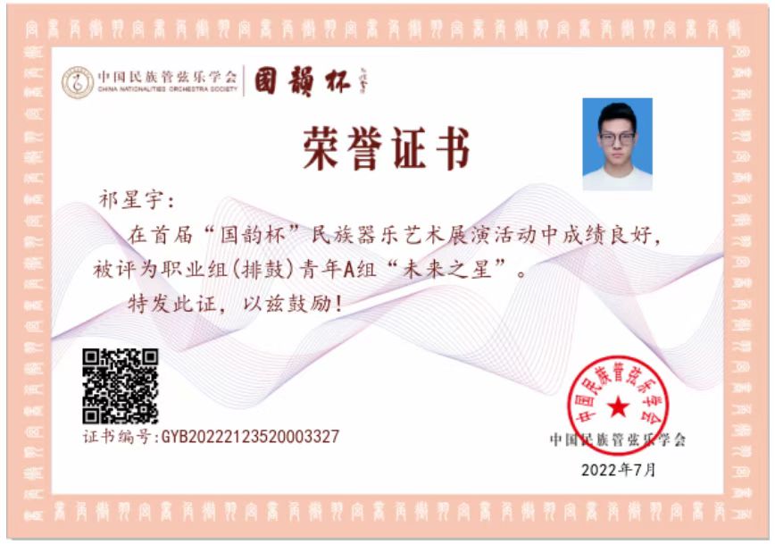 2020级打击乐专业学生祁星宇荣获“全球音乐教育联盟第一届青少年艺术展演”全国海选一等奖、省级展演一等奖、全国总展演二等奖;荣获“首届国韵杯民族器乐艺术展演”职业组(排鼓)青年A组未来之星。朱启宁老师荣获“优秀辅导教师”奖。