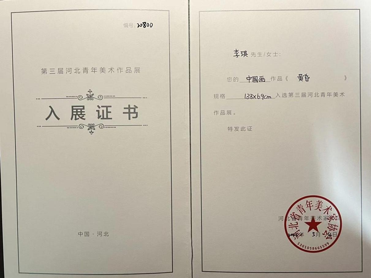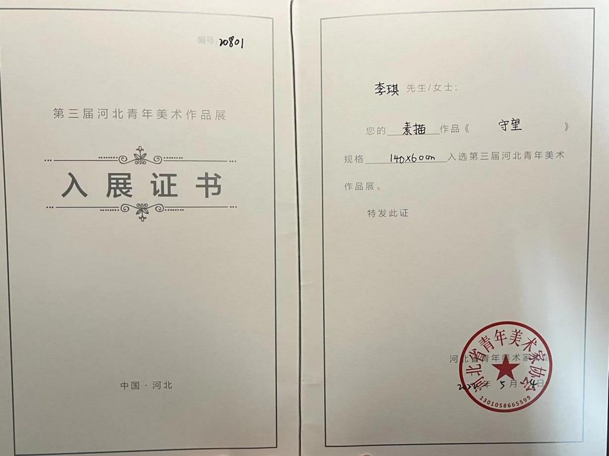 2019级绘画专业学生李琪荣获“第三届河北青年美术作品展”入选;“第三届河北青年美术作品展”入选;“第三届河北青年美术作品展”入选;“第二届大学生美术作品展”入选;“第三届大学生美术作品展”入选。
