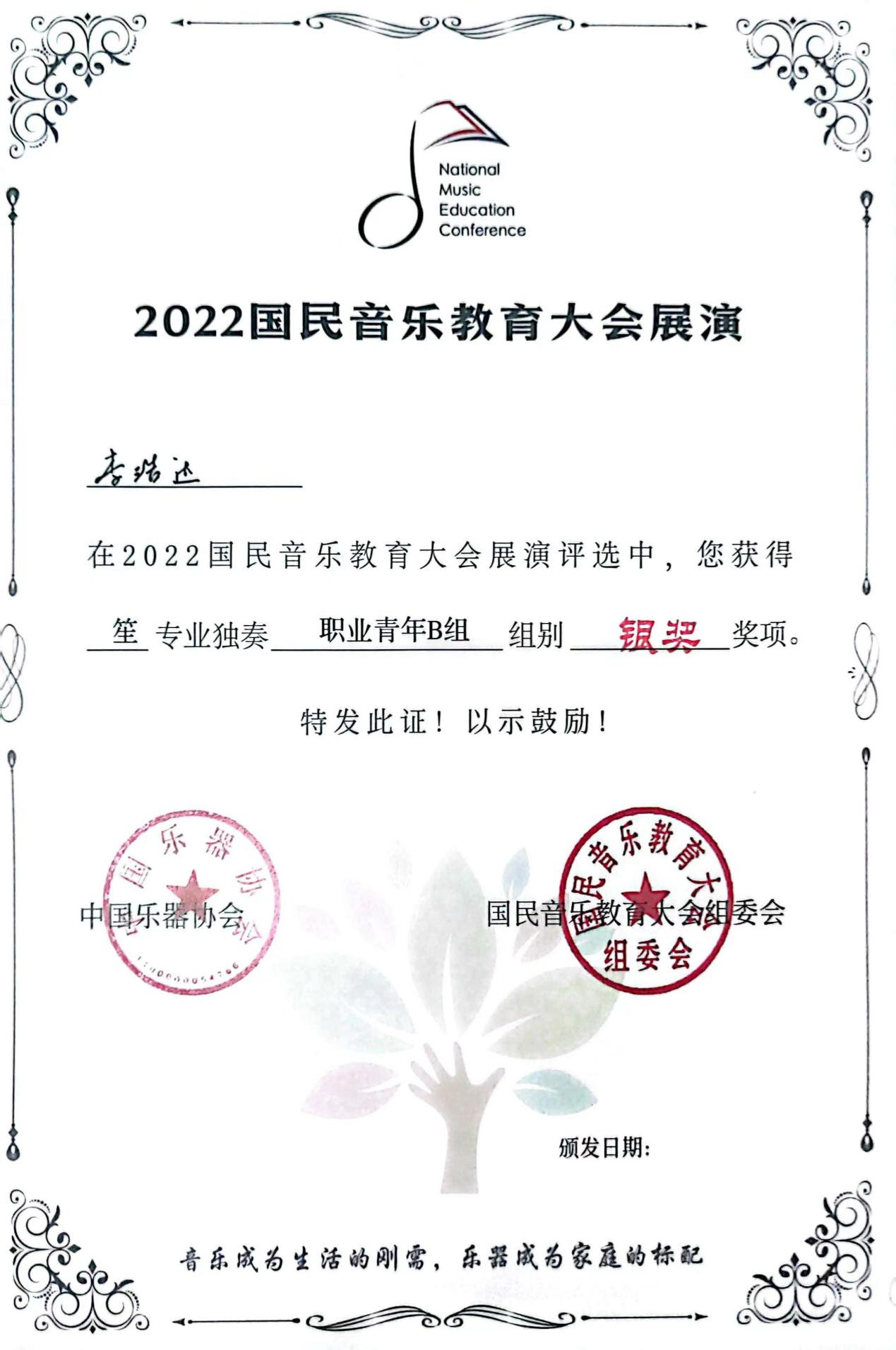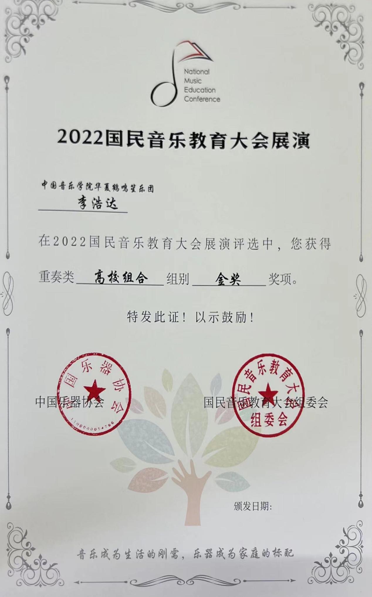2019级笙专业学生李浩达荣获“首届国民音乐教育大会展演”职业青年B组银奖;荣获“首届国民音乐教育大会展演”重奏类 高校组金奖。凌博老师荣获“优秀辅导教师”奖。