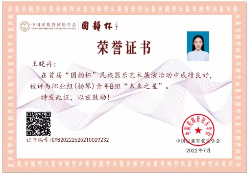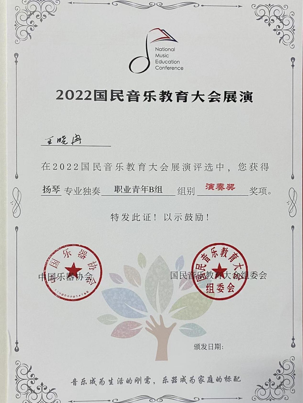 2020级扬琴专业学生王晓冉荣获“首届国韵杯民族器乐艺术展演”职业组(扬琴)青年B组未来之星;荣获“首届国民音乐教育大会展演”职业青年B组参演奖。张侠老师荣获“优秀辅导教师”奖。