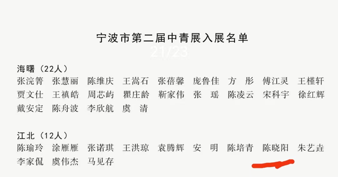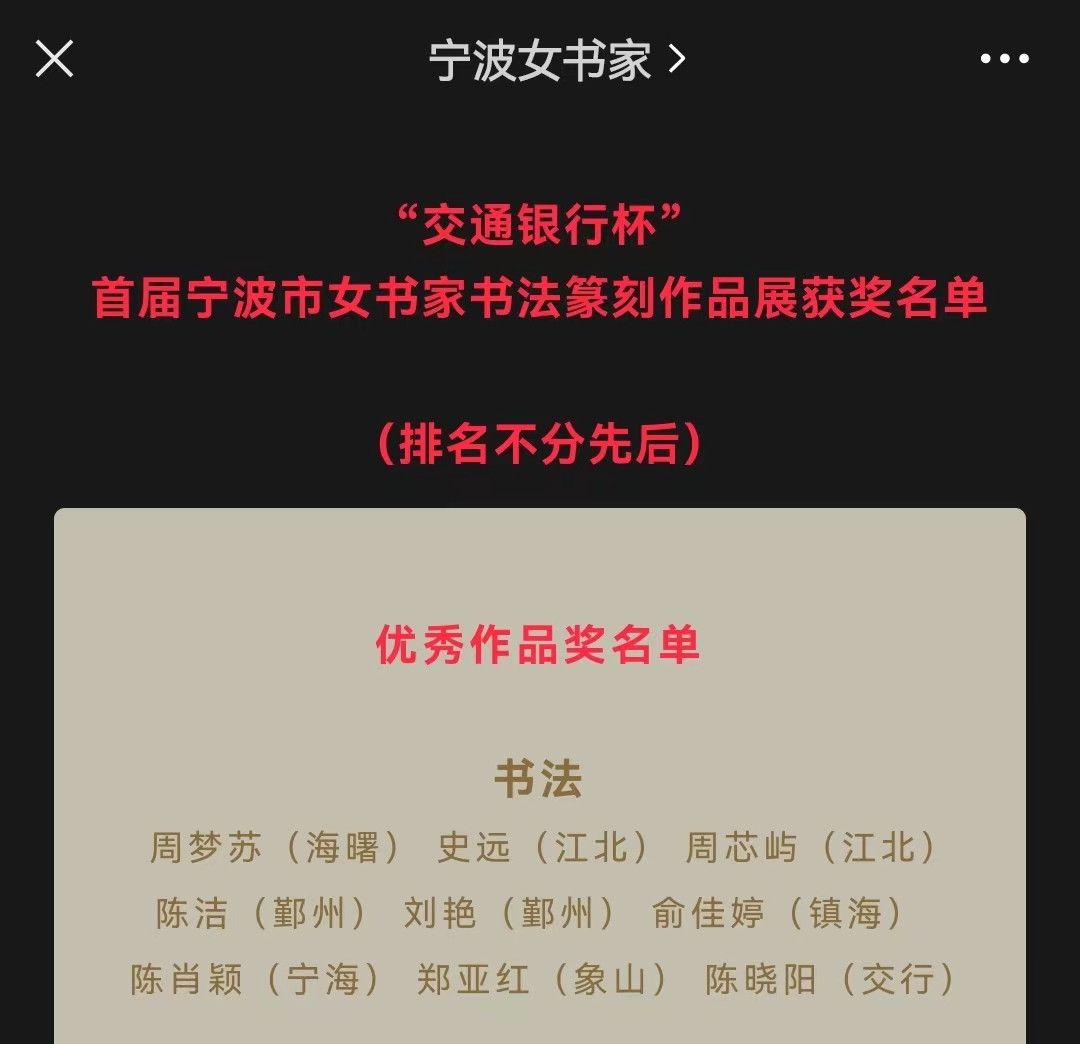 2021级书法专业学生陈晓阳荣获“第二届宁波市中青年书法篆刻展”入展;荣获“交通银行杯”首届宁波市女书法家书法篆刻作品展优秀作品奖。梁文斌老师荣获“优秀辅导教师”奖。