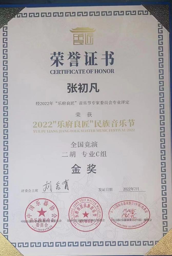 2020级二胡专业学生张初凡荣获2022“乐府良将”民族音乐节金奖。宋菲飞老师荣获“优秀辅导教师”奖。