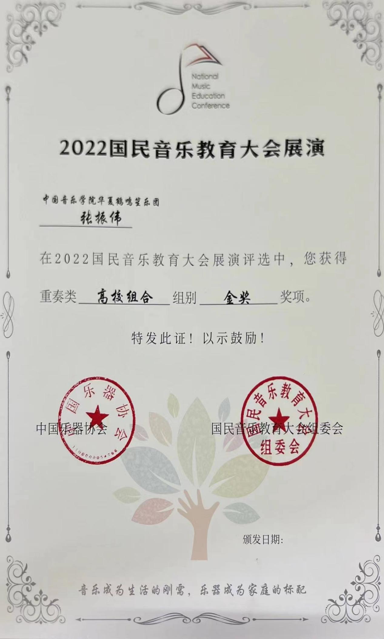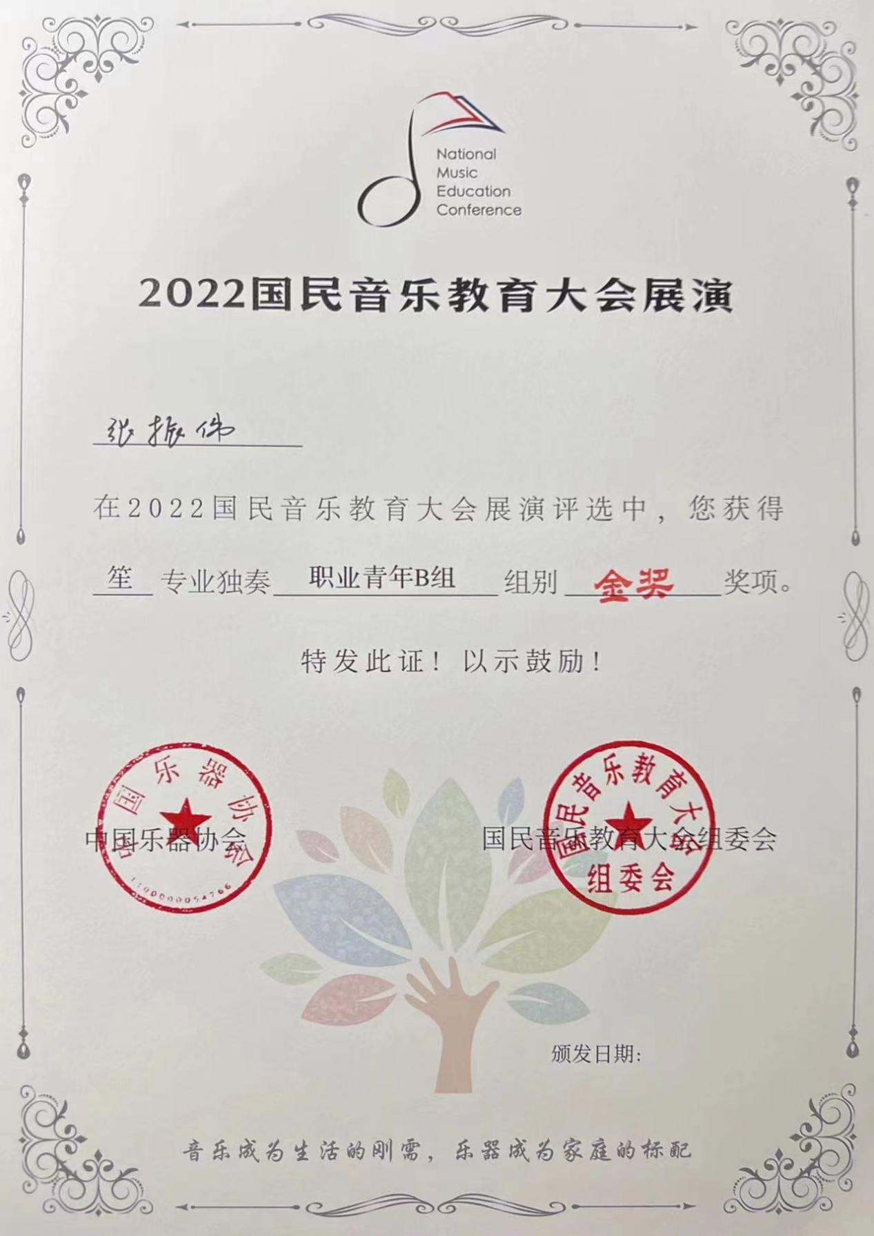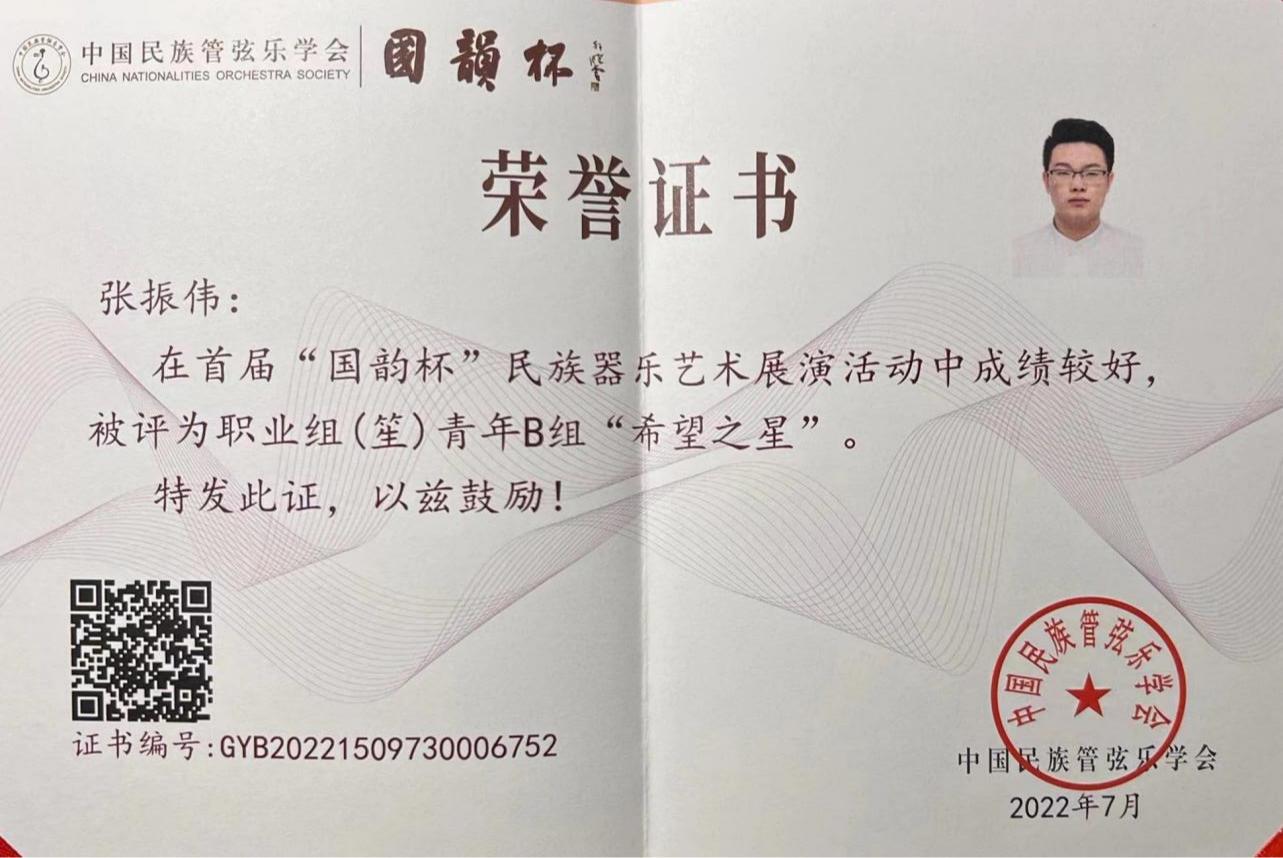 2020级笙专业学生张振伟荣获“首届国韵杯民族器乐艺术展演”职业组(笙)青年B组希望之星;荣获“首届国民音乐教育大会展演” 职业青年B组金奖;荣获“首届国民音乐教育大会展演”重奏类高校组金奖。凌博老师荣获“优秀辅导教师”奖。