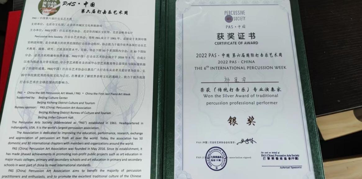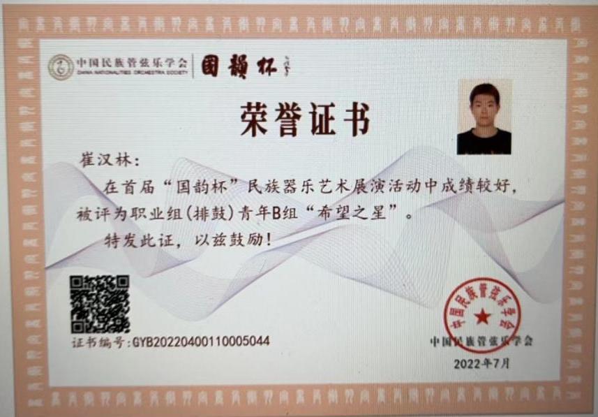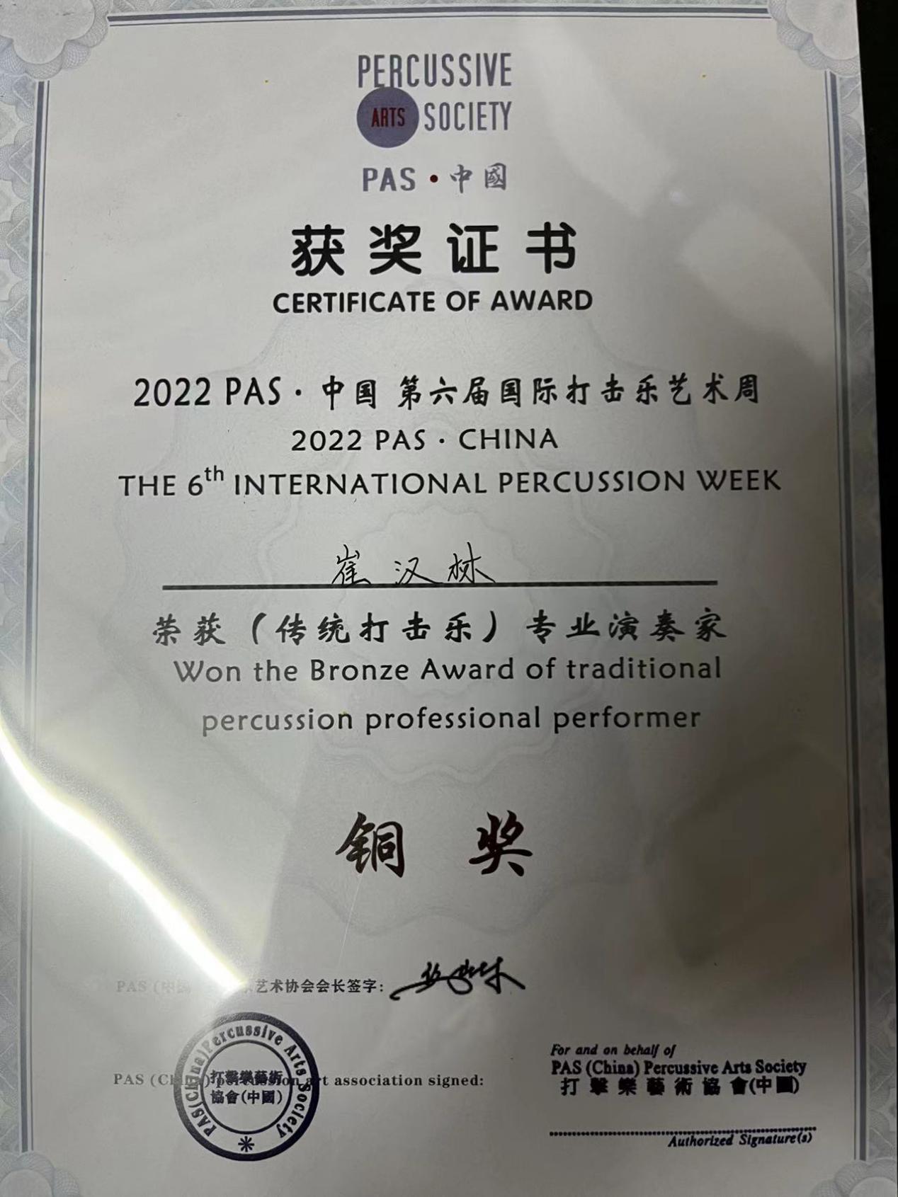2021级打击乐专业学生崔汉林荣获“全球音乐教育联盟第一届青少年艺术展演”全国海选一等奖、省级展演一等奖、全国总展演三等奖;荣获“首届国韵杯民族器乐艺术展演”职业组(排鼓)青年B组希望之星;荣获“2022PAS中国第六届国际打击乐艺术周”传统打击乐专业演奏家组铜奖。朱启宁老师荣获“优秀辅导教师”奖。