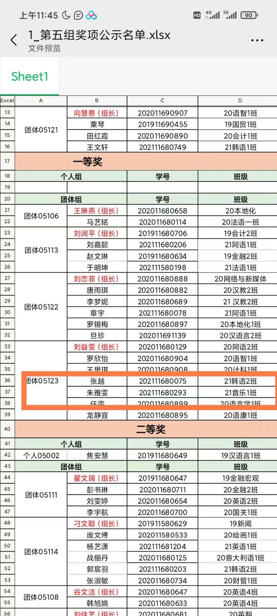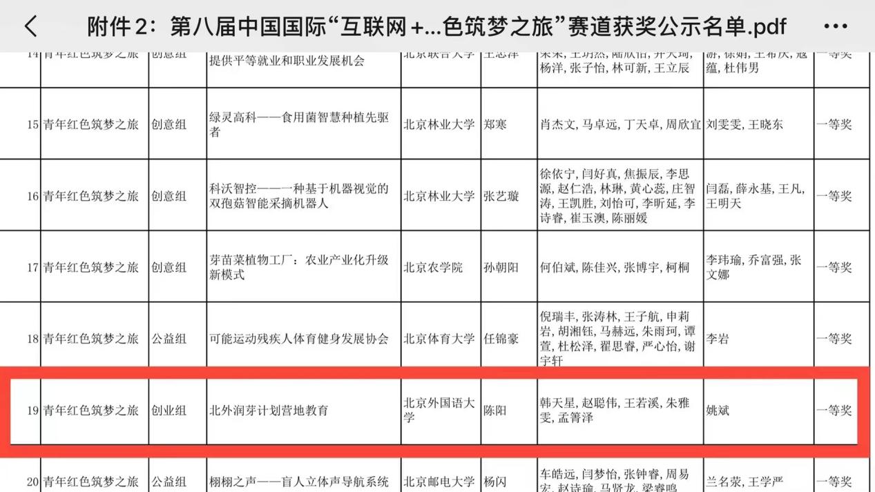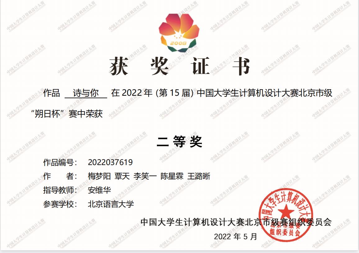 2021级声乐专业学生朱雅雯荣获“2022年北语千人千校寒假招生宣传社会实践活动”一等奖;荣获第八届中国国际“互联网+”大学生创新创业大赛北京赛区复赛“青年红色筑梦之旅”赛道一等奖。