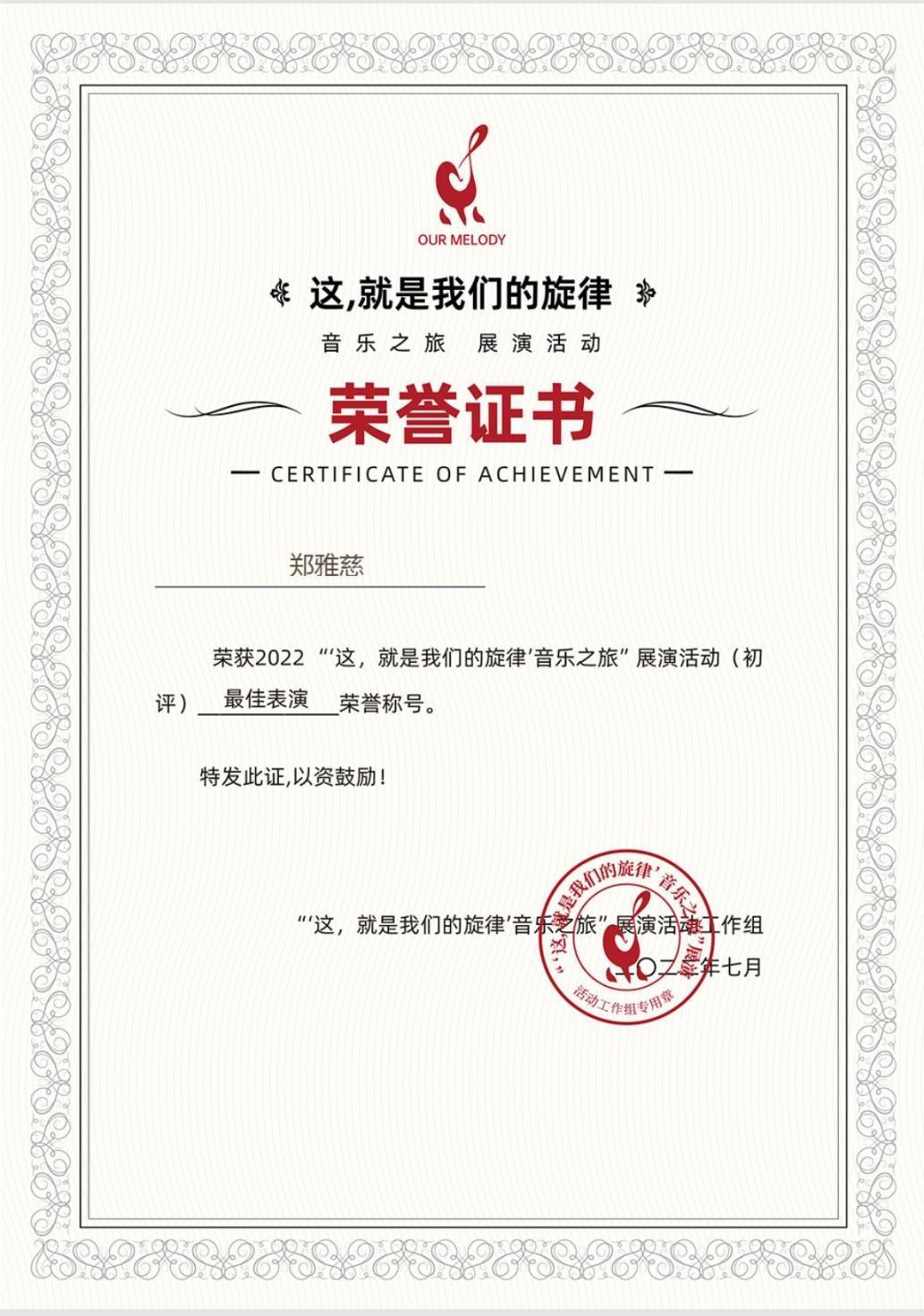 2021级声乐专业学生郑雅慈、郑佳杭荣获“这,就是我们的旋律2022年音乐之旅展演活动”优秀展演奖。董卿老师荣获“优秀辅导教师”奖。
