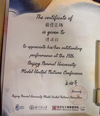 2021级书法专业学生傅琪钧荣获“2022年北语千人千校寒假招生宣传社会实践活动”二等奖;荣获“北京师范大学模拟联合国”最佳立场奖。