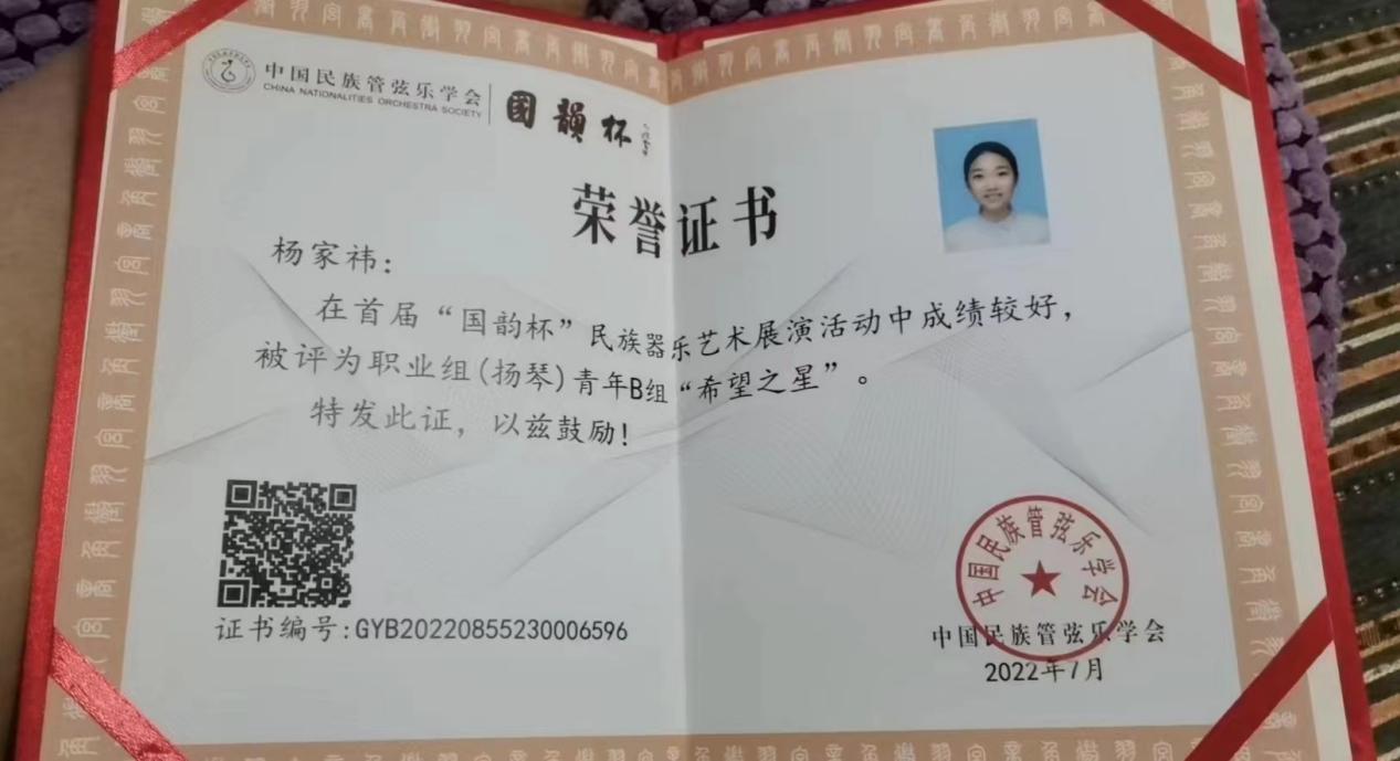 2021级扬琴专业学生杨家祎荣获“首届国韵杯民族器乐艺术展演” 职业组(扬琴)青年B组 希望之星;荣获“首届国民音乐教育大会展演”职业青年B组 参演奖。张侠老师荣获“优秀辅导教师”奖。