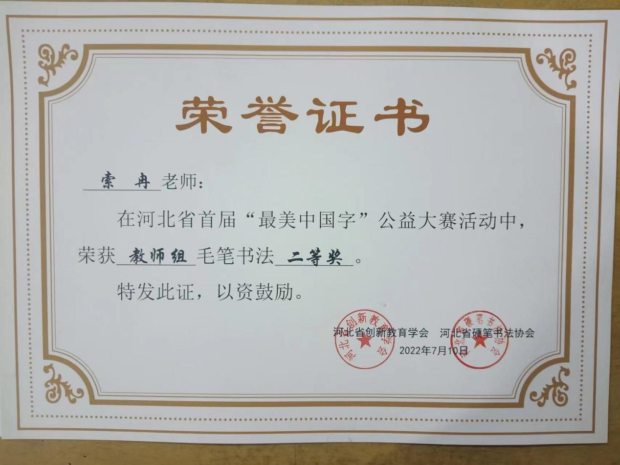 2021级书法专业学生索冉荣获河北省首届“最美中国字”公益大赛教师毛笔组二等奖。梁文斌老师荣获“优秀辅导教师”奖。