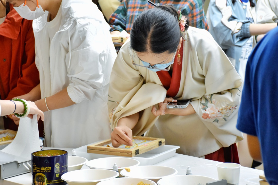 穿汉服的同学在体验古法造纸