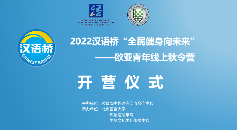 在中外语言交流合作中心的大力支持下,北京语言大学汉语速成学院和中华文化国际传播中心联合承办了“全民健身向未来”欧亚青年线上秋令营项目。希望通过“汉语桥”线上团组交流项目这一平台,透过双奥之城、全民健身、健康生活这三大视点,见微知著,落脚百姓生活,让世界看到一个意气风发、健康向上、富有活力和创造力的现代化中国形象。
