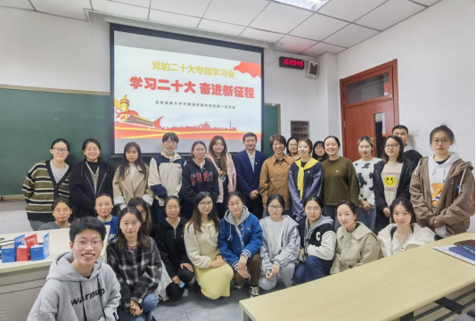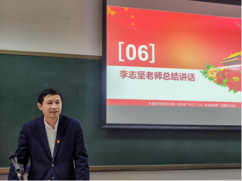 11月4日下午,外国语学部本科生第一党支部组织开展了以“学习二十大,奋进新征程”为主题的党日活动。学校办公室主任李志坚、学部党委副书记刘洁出席了本次活动,与支部全体党员和发展对象共同学习了中国共产党第二十次全国代表大会报告的重要精神。支部副书记唐诗琪主持了本次活动。