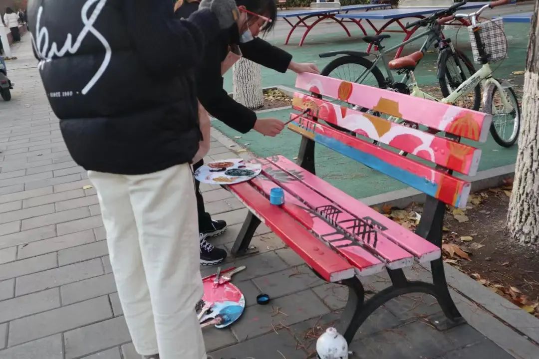 涂鸦的主题各种各样,有可爱的冰墩墩、美丽的风景画,还有不同的卡通人物。完工后的长椅充满了趣味和创意,过路的行人们纷纷驻足欣赏。