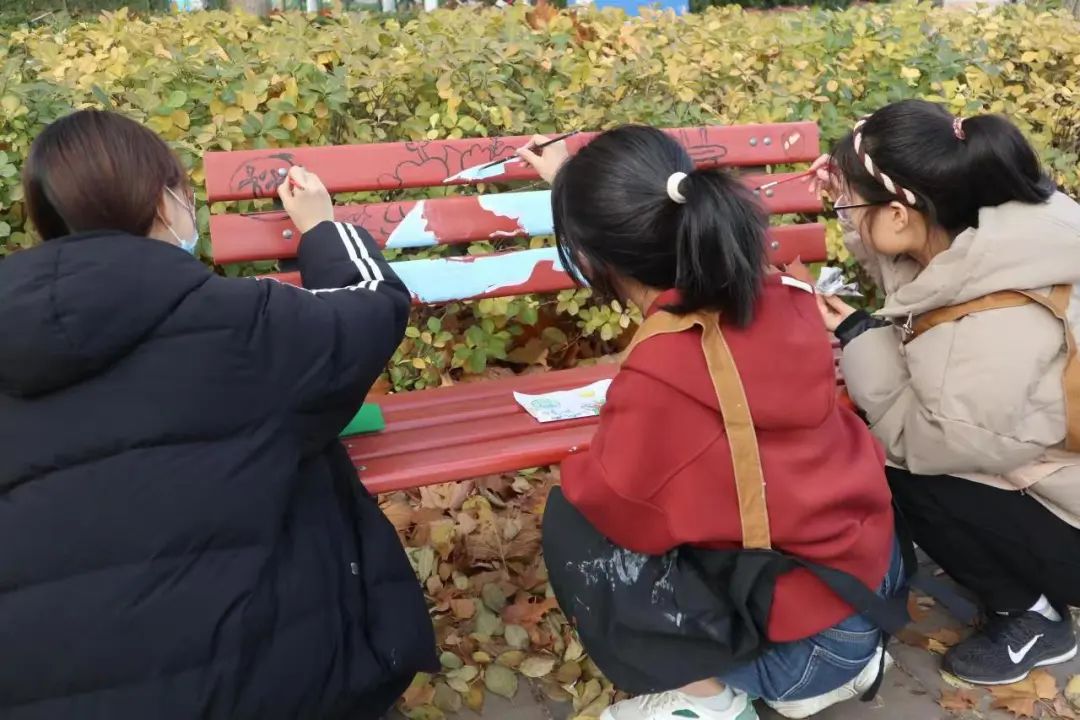每组志愿者的涂鸦方式各不相同,有的在长椅上勾画出不同的轮廓、为填色做准备;有的直接用色彩相互组合调配,描绘出亮丽的图画。他们工作认真,专注地装扮着校园的长椅,为校园增添了一份美好。
