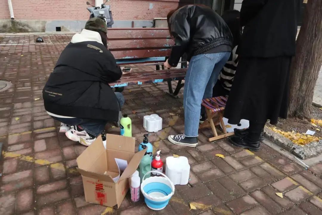 涂鸦地点分布在篮球场附近、梧桐大道两侧和教学楼三楼前。志愿者分工明确,清洗长椅上的尘土、摆放物品、调配颜料……不久便完成了准备工作,正式开始涂鸦。