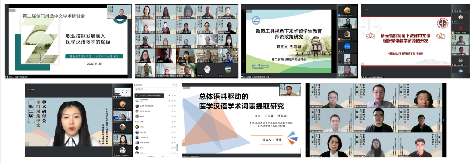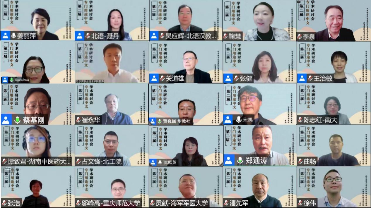 为助力国际中文教育多元发展,共同探讨专门用途中文教学与研究的核心问题,促进“中文+专业”“中文+职业技能”“中文+特色项目”等跨学科的融合发展,2022年11月26-27日,由北京语言大学国际汉语教学研究基地/汉语国际教育研究院主办的“第二届专门用途中文学术研讨会”以线上方式成功召开。会议设主旨报告、圆桌论坛和分组研讨等环节,来自全国242所高校和研究机构的660余位专家、学者及高校师生齐聚云端,共襄盛举,为专门用途中文教育高质量发展贡献智慧。