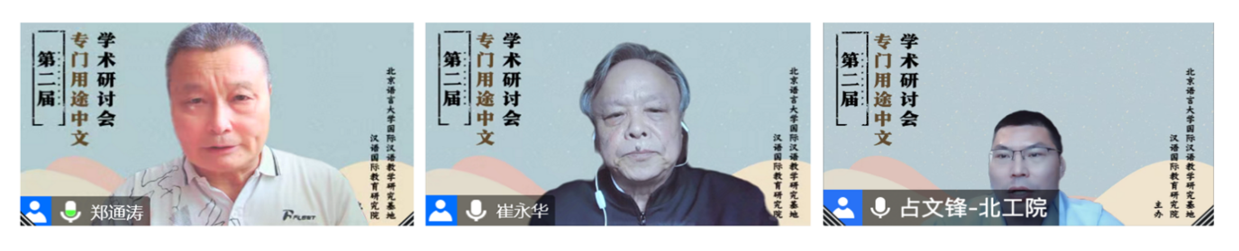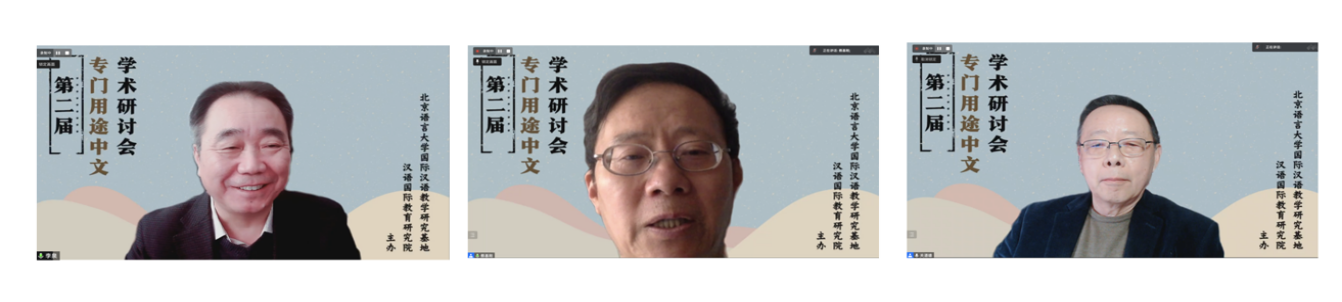 第三场主旨报告于27日上午举行,由北京语言大学汉语学院院长张浩教授主持。厦门大学海外教育学院郑通涛教授、北京语言大学崔永华教授、北京工业职业技术学院占文锋教授分别就专门用途中文的学科定位、教材编写、教学资源建设等问题作了主旨报告。主旨报告后,发言专家与线上参会师生进行了热烈的互动交流。