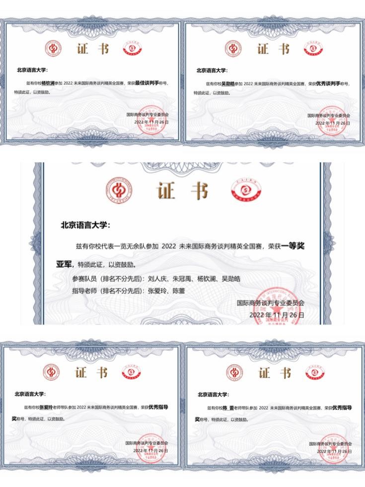 最终,北京语言大学代表队出色地完成了本次比赛,荣获总亚军、团体一等奖。队伍的指导老师张爱玲教授、陈蕾副教授荣获“优秀指导奖”,杨钦澜同学获得“最佳谈判手”称号,吴勋皓同学获得“优秀谈判手”称号。