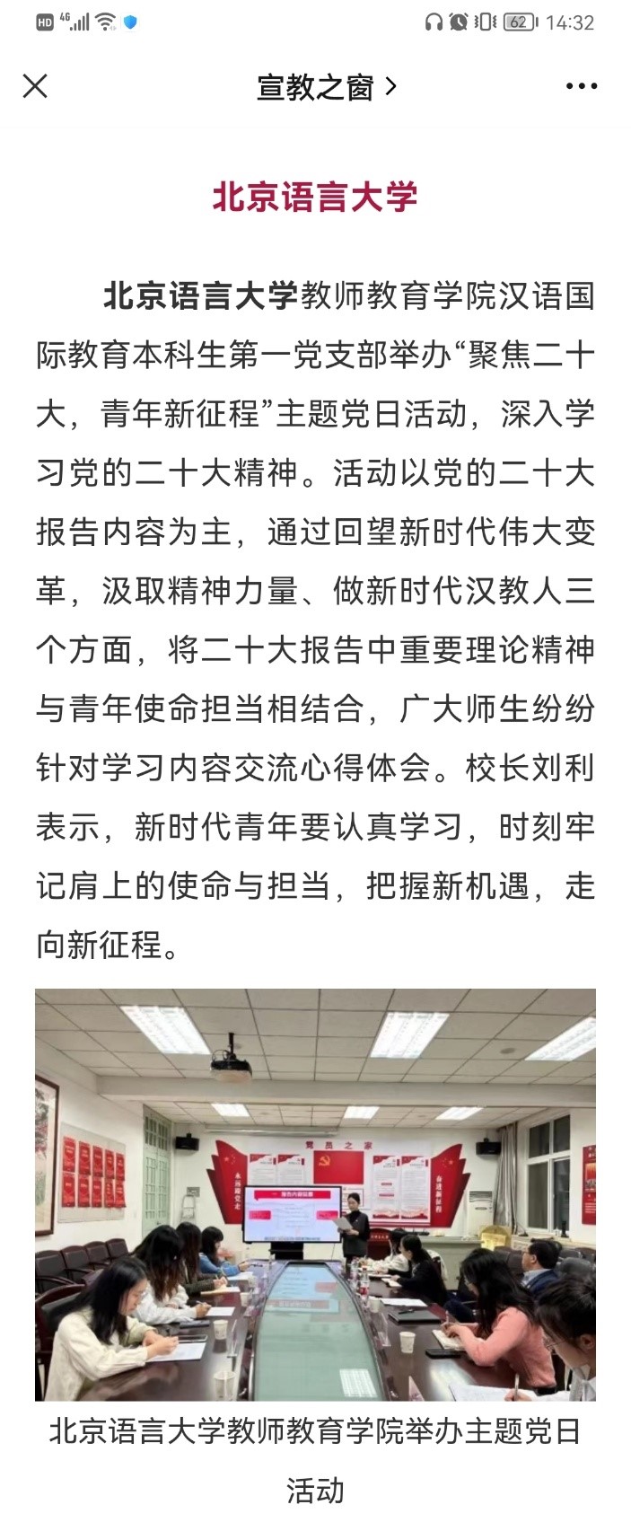 首都宣教之窗微信公众号报道汉教一本科生党支部主题党日活动