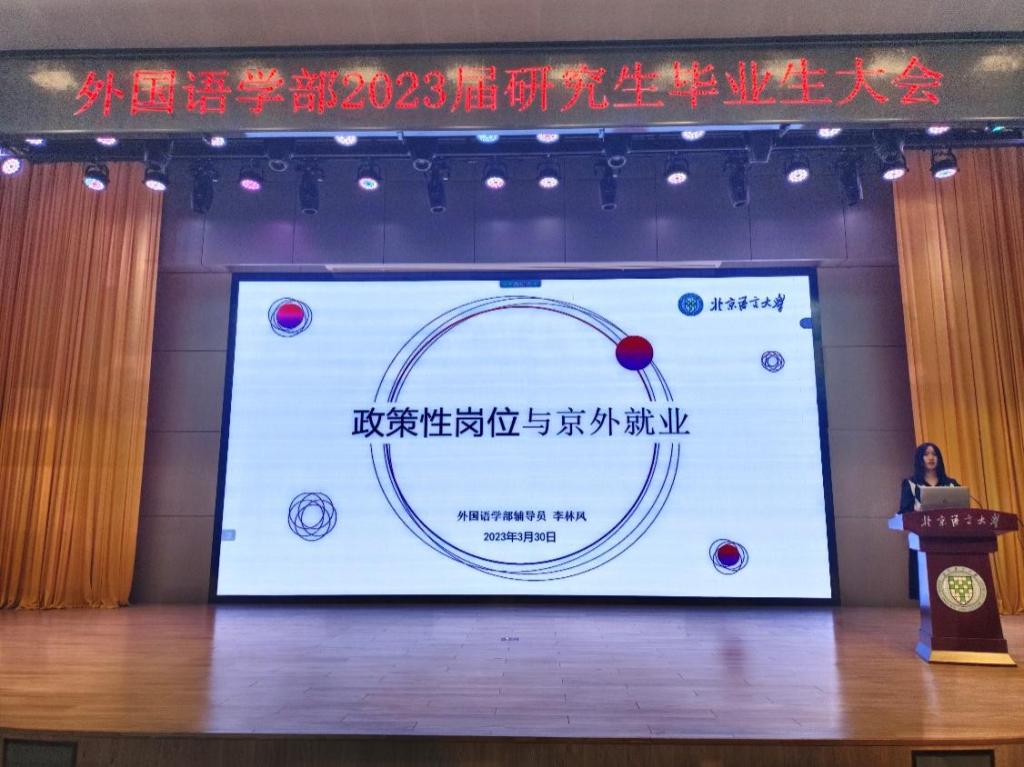 3月30日中午,外国语学部2023届研究生毕业生大会于教一楼209报告厅顺利召开。参加本次会议的有外国语学部杨峻副主任、刘洁副书记、研究生辅导员曹鑫老师、李林凤老师、李晓航老师及2023届全体研究生毕业生,会议由曹鑫老师主持。考虑到部分毕业生同学正在实习不能及时到场参会,本次大会于线上及线下同时召开。