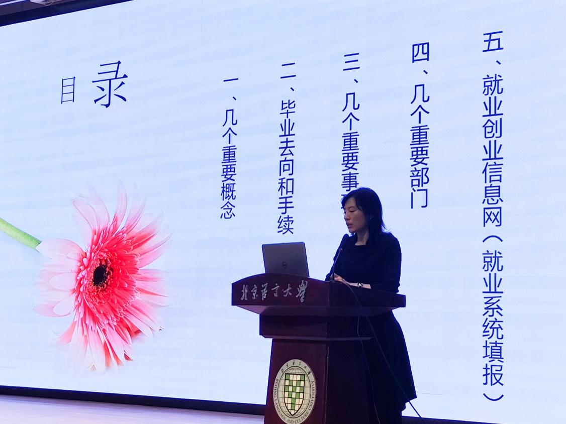 接下来,学办负责人曹鑫老师向毕业生详细介绍了就业相关手续和流程,以帮助同学们了解就业及毕业手续的办理。首先曹老师向同学们解释了几个重要概念,并对毕业去向和户口、档案迁转事宜进行了细致说明,老师还特别指出了今年与往年毕业手续的不同。接着,曹老师向大家演示了不同就业去向的毕业生应如何在就业创业信息网进行填报,以及大家在毕业前后需要办理的各类手续。此外,老师还介绍了就业相关的几个重要部门,方便日后毕业生们有针对性地进行咨询。