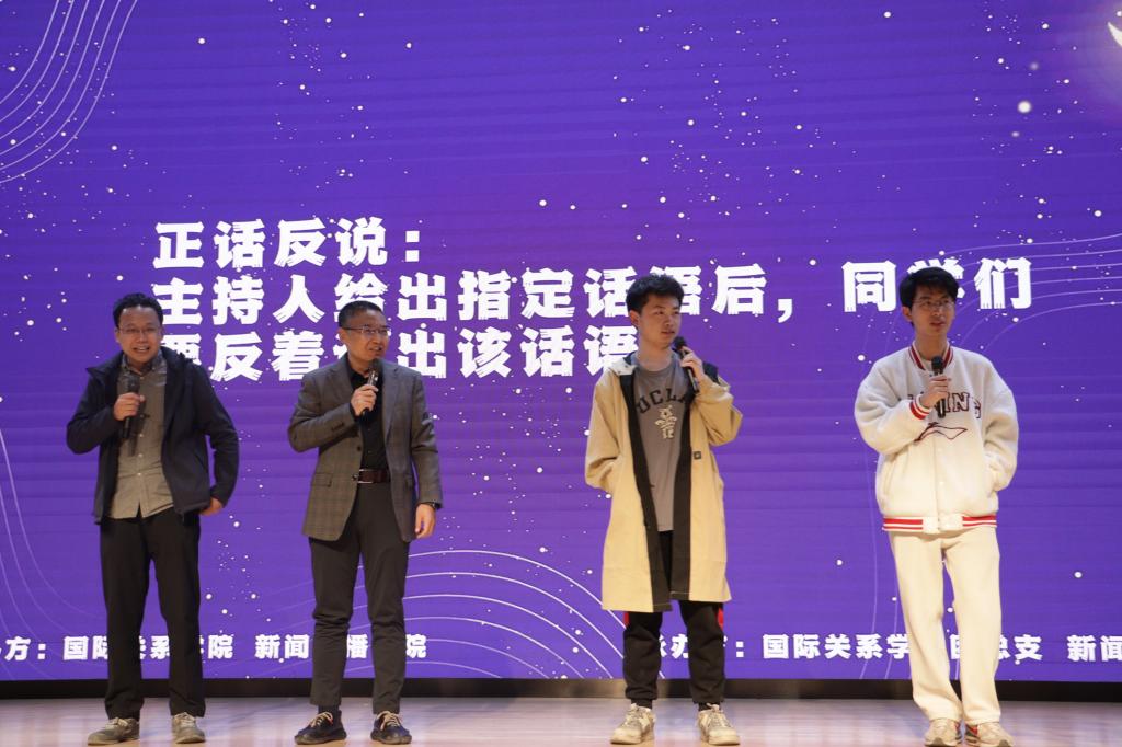 中场游戏环节由“听令行事”和“正话反说”组成,云国强老师和刘舒天老师也走上舞台,和同学们一起参与游戏,大家玩得不亦乐乎,舞台上下阵阵欢腾。