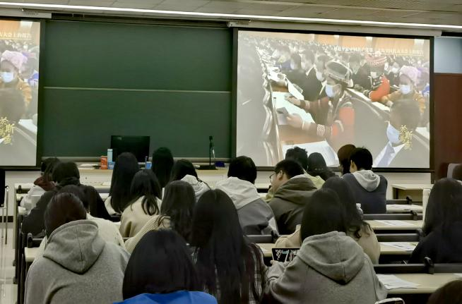 在计票期间,主持人为大家播放了《于斯为盛》学习视频,希望同学们能从中受到启发,了解新中国崛起的过程与当下中国的发展状态,肩负起实现中华民族伟大复兴的责任,在成就无悔青春的过程中书写时代华章。