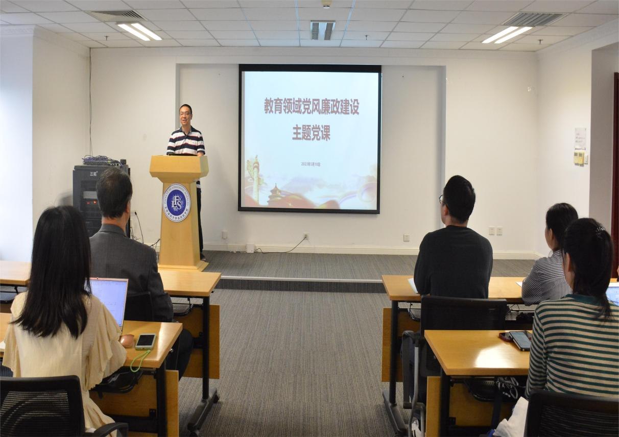 彭恒利书记讲党课结束后,语言科学院副院长、党总支纪检委员黄伟以“教育领域党风廉政建设”为题向语言科学院师生党员讲专题党课。专题党课上,黄伟副院长向与会师生党员梳理并介绍了《中国共产党章程》《中国共产党廉洁自律准则》《中国共产党纪律处分条例》所列出的各项党规党纪,要求党员同志增强纪律规矩意识,从自身做起,严格执行和维护党的纪律,自觉接受党的纪律的约束。随后,黄伟副院长简要介绍了《中小学教师职业道德规范》《高等学校教师职业道德规范》《新时代高校教师职业行为十项准则》等中小学及高校教师职业道德规范准则,并选取教育部公开曝光的违反教师职业行为十项准则的典型案例进行了分析,要求语言科学院教师党员与准备从事教师职业的研究生党员引以为戒,加强对教师行为规范准则的学习,严于律己,不断涵养高尚师德师风。
