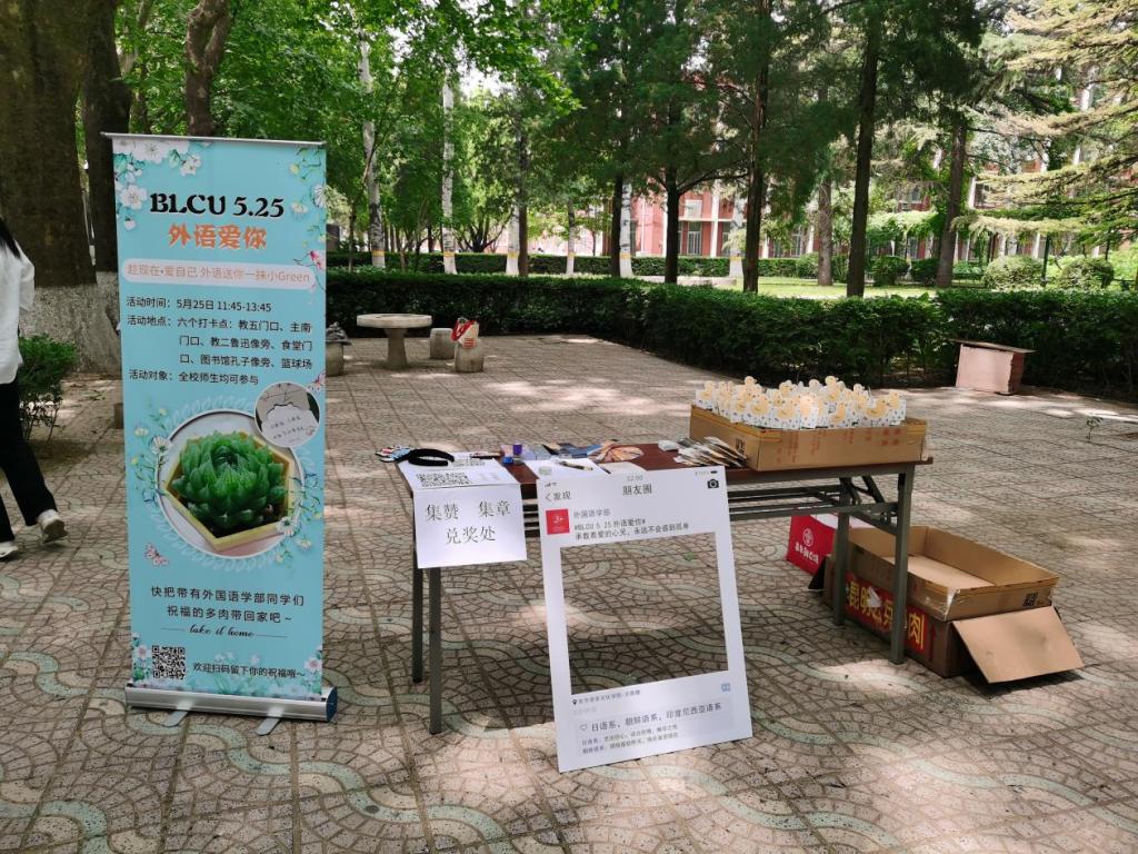 正值北京语言大学第二十四届“5.25”心理健康季,为助力同学们心理健康发展,送上美好祝福,外国语学部于5月25日中午举办了“BLCU· 5.25外语爱你|趁现在·爱自己 外语送你一抹小Green”活动。通过认养多肉、发布社交媒体集赞、集章打卡等方式,为全校师生送去了附有暖心留言诚意满满的多肉盆栽和活动纪念品。