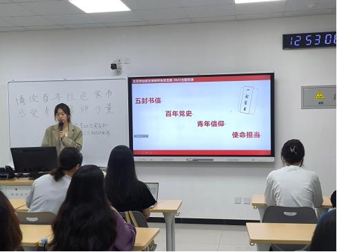 5月19日中午,文艺学比较文学研究生党支部在教二楼108教室开展了以“诵读百年红色书信,感受青年信仰力量”为主题的支部书记讲党课活动。支部书记姜迈千以五封分别写于中国共产党百年奋斗不同时期的书信为线索,串联起中国共产党的百年奋斗史,为支部党员展示了中国共产党人的初心和使命,体现了党和国家建设取得的辉煌成就。