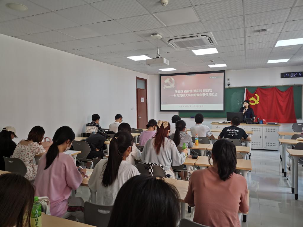 6月2日下午,本科生第一党支部开展了以“学思想,强党性,重实践,建新功——对外交往大局中的青年责任与担当”为主题的支部书记讲党课活动。本科生第一党支部书记、团委书记玄铮老师向同学们介绍了习近平总书记关于青年工作的重要论述,强调了青年对于我们党的战略性意义,并带领同学们梳理了中国共产党领导下的青年对外工作的发展历程,以及在中国对外交往大局中北语使命。在向同学们展示了对外交往中的青年力量后,玄老师提出青年学子应当在学习习近平总书记的论述中明确自己的责任与担当,并据此提出了三点努力方向:一是要明辨是非、恪守正道;二是要有自讨苦吃的精神;三是要做到“三个务必”。
