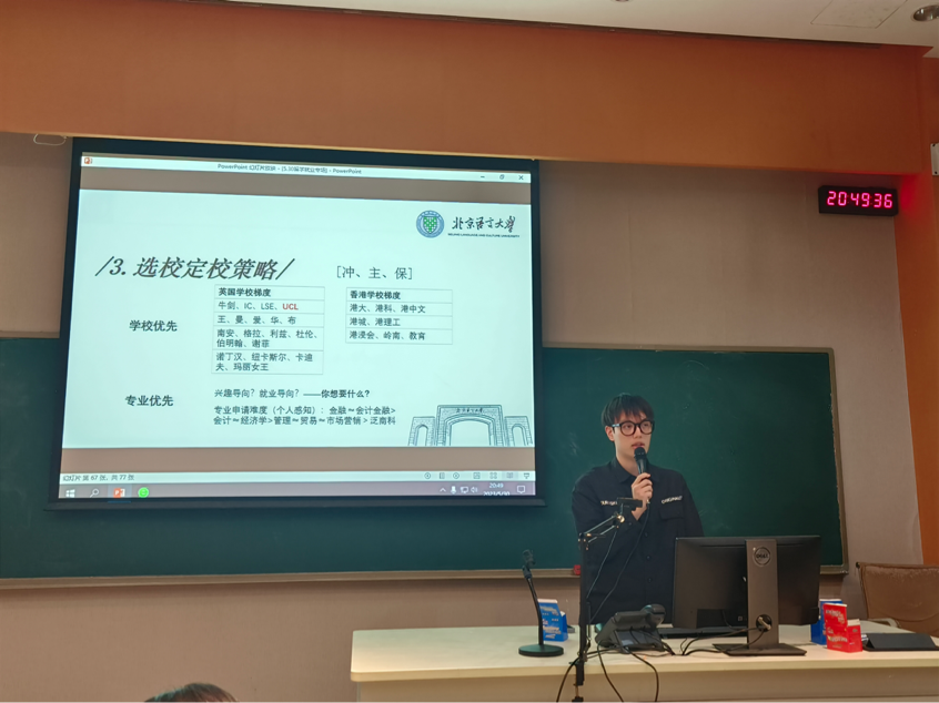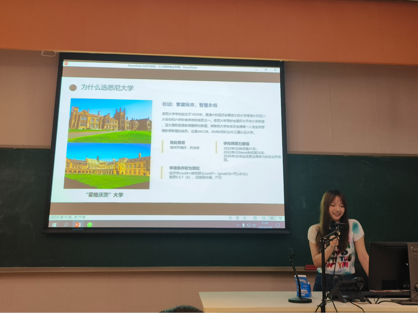 获得纽约大学offer的俞惠之分享了留学申请的若干重点,前期应努力提升绩点,争取科研与实习机会,申请时要把握好各个学校申请时间,同时应辩证地看待网络信息,不能盲目听从代入。收到曼彻斯特大学录取通知的易涵韬以风趣幽默的语言给同学们分享经验,他表示留学申请是双向的,除了要明确自身定位,展示个人的最大优势外,还要充分了解目标院校,有的放矢。被悉尼大学录取的毛蔚然讲述了自己选择澳洲留学的心路历程,使大家对如何选择地区有了更清晰的认识。分享结束后,同学们就如何提升外语水平、准备面试等方面进行提问,得到了学长学姐的耐心解答。