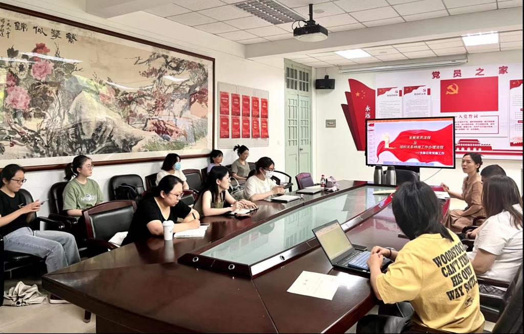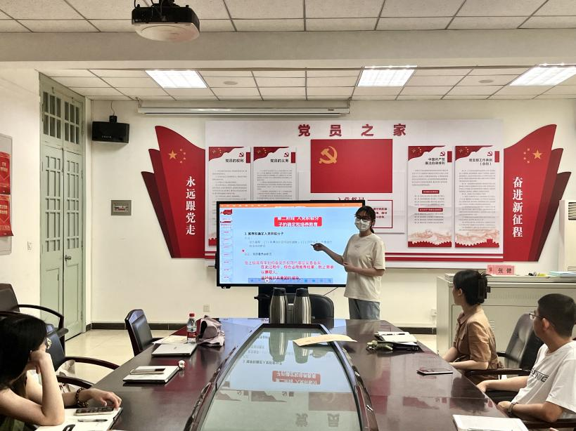 为深入开展学习贯彻习近平新时代中国特色社会主义思想主题教育,提升基层党支部工作规范性,6月7日,在辅导员李晗老师的组织下,研究生党支部协同推进支部日常党建工作,现当代文学研究生党支部书记叶雨为全体参会支委讲解“发展党员流程及组织关系转接工作办理流程”的相关内容。