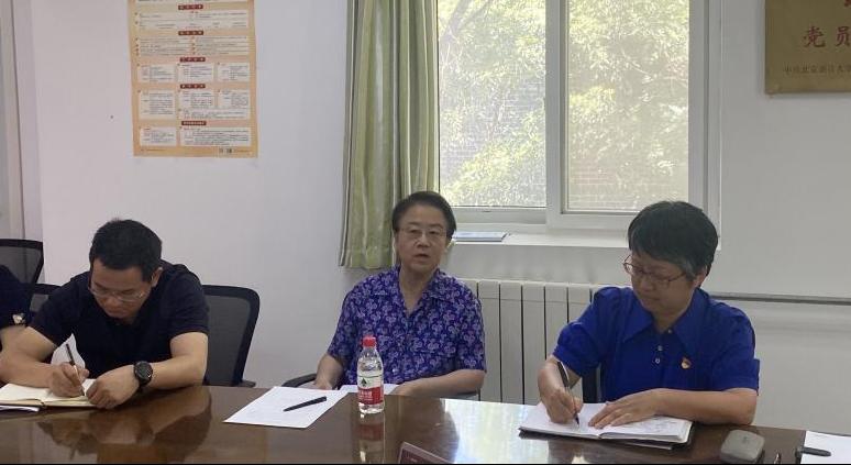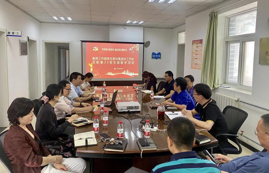 为深入开展学习贯彻习近平新时代中国特色社会主义思想主题教育,加强部门合作交流,发挥好老同志经验优势,6月8日,教师工作部党支部与我处在职第33党支部召开联学交流会,围绕新时代如何发挥好老教师在师德师风建设和教师发展工作中的传帮带作用,开展了深入交流讨论。交流会由离退休工作处党委书记、在职第33党支部书记崔克娟主持。会议特邀学校关工委委员、学校教学督导组组长刘谦功教授参加。教师工作部部长展明锋、副部长张坤、李建成以及全体支部成员、离退休工作处处长罗立祥、副书记李学军、副处长金尧和全体支部成员参加会议。