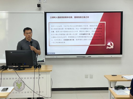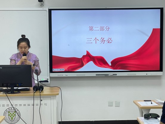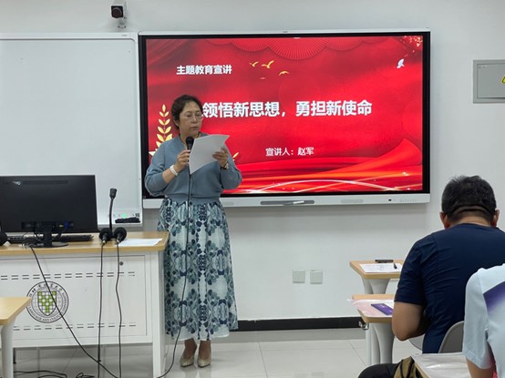 开班仪式结束后,进入理论学习环节,由中心支部两位优秀共产党员分享主题教育学习感悟。赵军同志宣讲的主题是“领悟新思想,勇担新使命”。赵军同志爱岗敬业、履职尽责,牢记习近平总书记“建设教育强国”的殷殷嘱托,多年深耕教学服务保障工作一线,积极解决师生急难愁盼问题,坚持在平凡的岗位上铸就不平凡的业绩。今年5月,赵军同志被学校推荐为北京市优秀本科教学服务保障人员,这一荣誉既是学校对她个人多年扎实工作的鼓励,也是对中心教学服务保障工作的认可。赵军同志用自己的实际行动,为大家诠释了共产党员的使命与担当。