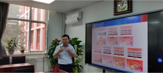 刘洪森副教授作为课题组主要成员参与了两门课程的教材编写工作。他以《教材、教学、教法》为题,清晰而全面地介绍了这两门课程教材的版本沿革和逻辑关系,结合“毛泽东思想和中国特色社会主义理论体系概论”的教学实际分享了教材向教学转化的思路和经验,分析了两门课程各自的教学特点和重点。提出课程应做到问题导向、内容为王,教师要善于在理论中发现历史,通过丰富的教学素材将课程讲准、讲深、讲透、讲活。