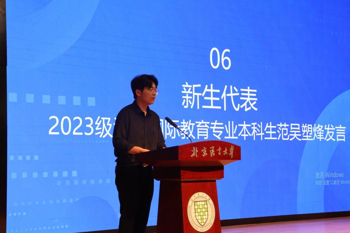 2023级汉语国际教育专业本科生范吴塑烽是此次的新生代表,他对于大学崭新的生活充满了期待与憧憬,渴望在北语、在教院探索更广袤的天地,学到扎实的专业知识,丰富自己的人生经历。并代表新生郑重表态,作为新一代青年人,肩负着民族复兴重任,定当立大志以善始,慎忽微而善成,心怀长远,脚踏实地,积极奉献人民与社会。并祝愿各位一道而来的新生为学而正德广识,为人而心怀万邦,最终以敦睦天下。