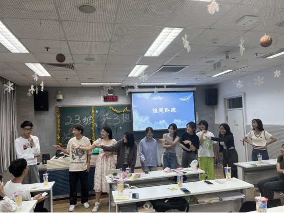 活动进行中,整个班会厅充满了欢声笑语。热情洋溢的主持人上台,以激动人心的开场白为整个班会增添了无限的活力。奶茶零食负责营造派对氛围,别出心裁的破冰小游戏迅速拉近同学们的距离,惩罚环节同学们的即兴表演让大家丢下包袱,开启唱跳。一直在幕后工作的班助们也纷纷登场,和同学们打成一片,共同喜乐。