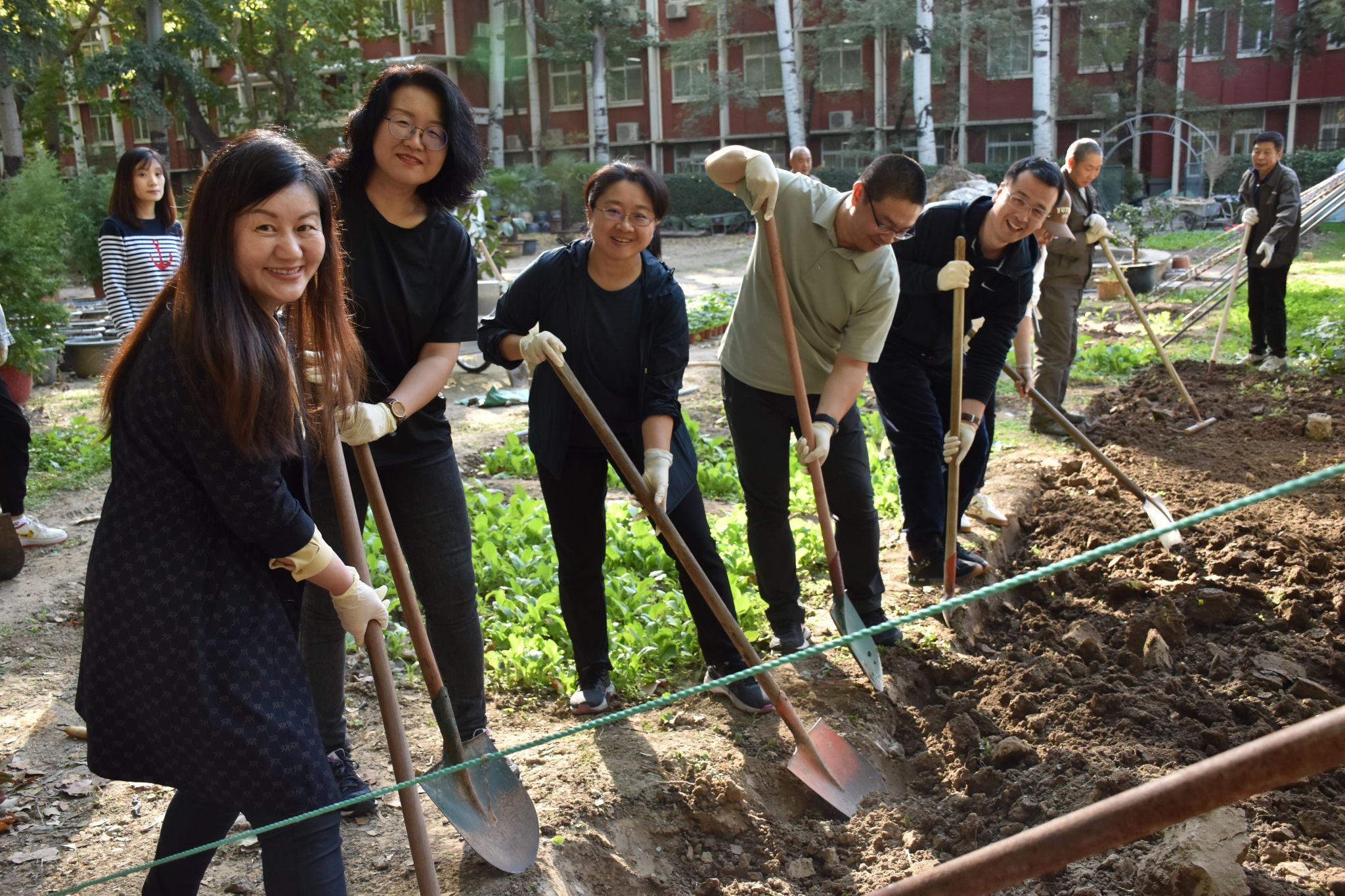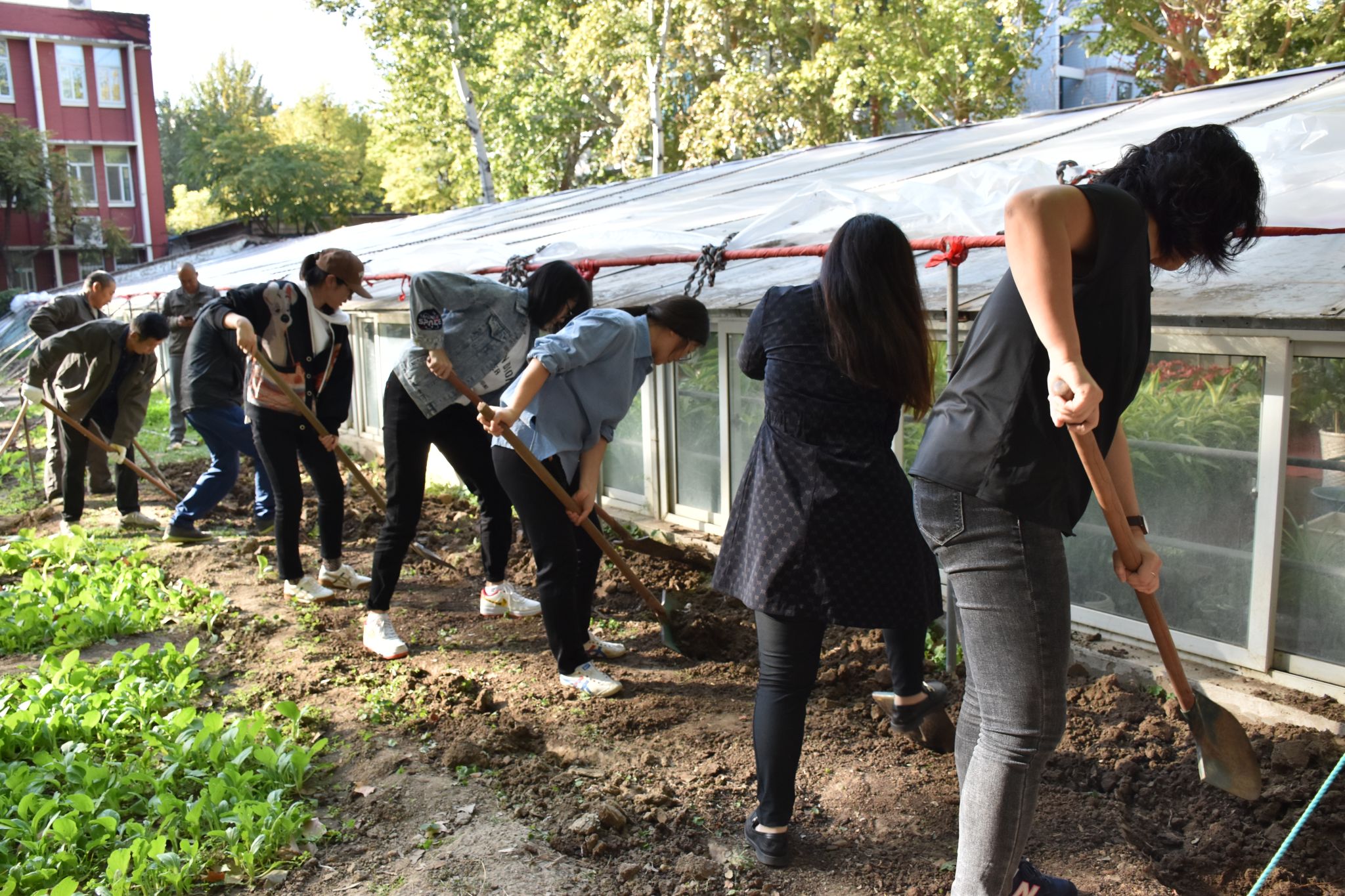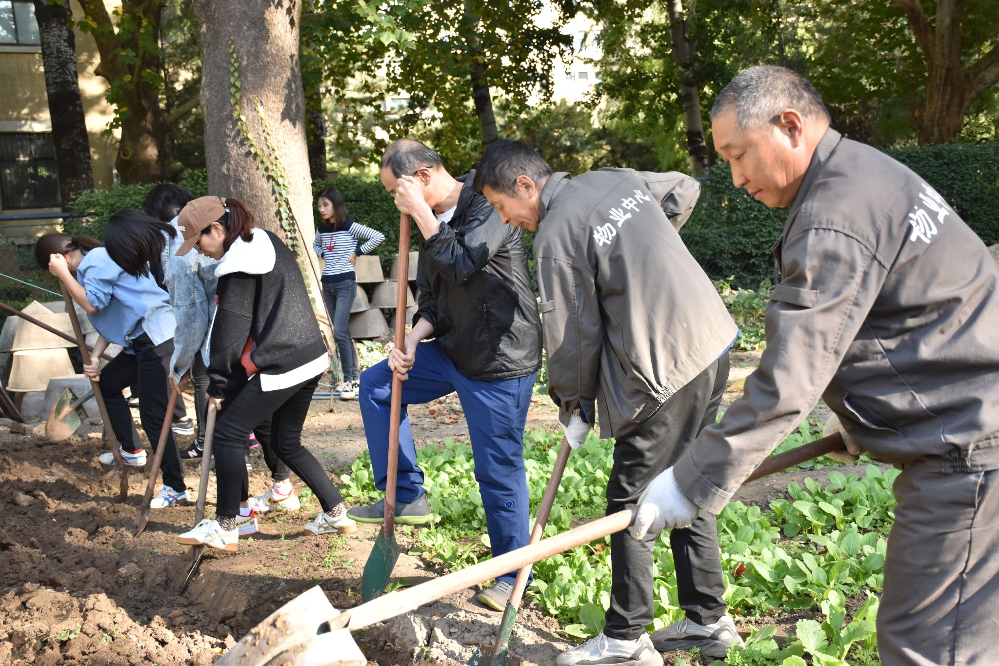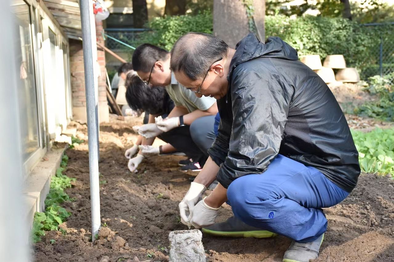本次主题党日活动内容是在学校花房学习并实践大蒜种植。下午两点半,党员们在学校花房集合,首先观摩师傅们翻土,平地、开垄,学习种大蒜的要领,然后动手尝试使用农具开垦土地,把大蒜均匀种植于垄间。据介绍,大蒜是一种生命力很强的植物,易于成活。大家积极性很高,踊跃参与,最终在师傅们的帮助下,种植大蒜成功!