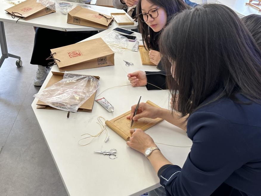 第二部分陈老师带领支部同学们体验了简单的掐丝珐琅工艺,从初期掐丝造型,到中期点蓝创作,最后完工后封层加固。一副简单的茶盘图画花费了两小时,同学们亲身体会到了非遗工艺精彩绝伦的技术,对传承人的工作肃然起敬。