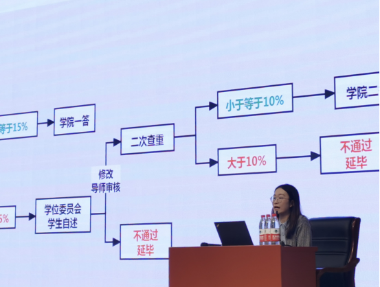 首先,副院长祁大伟强调学生应遵守学术规范,保证写作质量。学位论文作为本科阶段的学习成果展示,将会长久地伴随学生的学术和职业生涯。各级教育主管单位将通过毕业论文管理平台、学位论文抽检等方式对于写作过程、论文质量实行多方位、全流程的管控。作为“论文第一责任人”,学生应在论文撰写的过程中合理安排留出余量、积极主动高效沟通,在坚守学术原创原则的基础上以一篇高质量的学位论文作为本科阶段学习的全面总结。