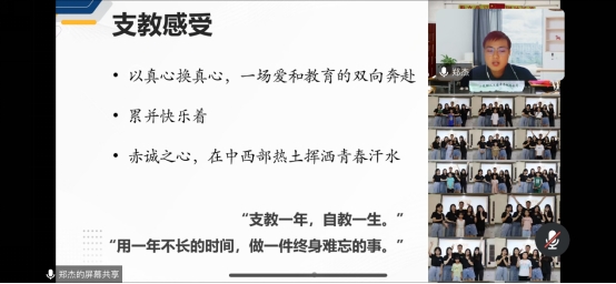 本次宣讲活动邀请了来自我校2021届信息管理与信息系统专业本科生毕业生韩诗淼、2023届翻译(本地化)专业本科毕业生刘慧敏、2023届汉语国际教育专业本科生毕业生郑杰、2023级语言学及应用语言学专业在读研究生陈洁共4名基层就业先进典型代表进行宣讲,同时还邀请了北京语言大学第24届研究生支教团队长、心理学院2023级发展与教育心理学专业在读研究生王诗然介绍研究生支教团相关情况。5位宣讲人结合个人选择和自身基层工作经历,分享了在基层工作中的感悟体会和成长收获。