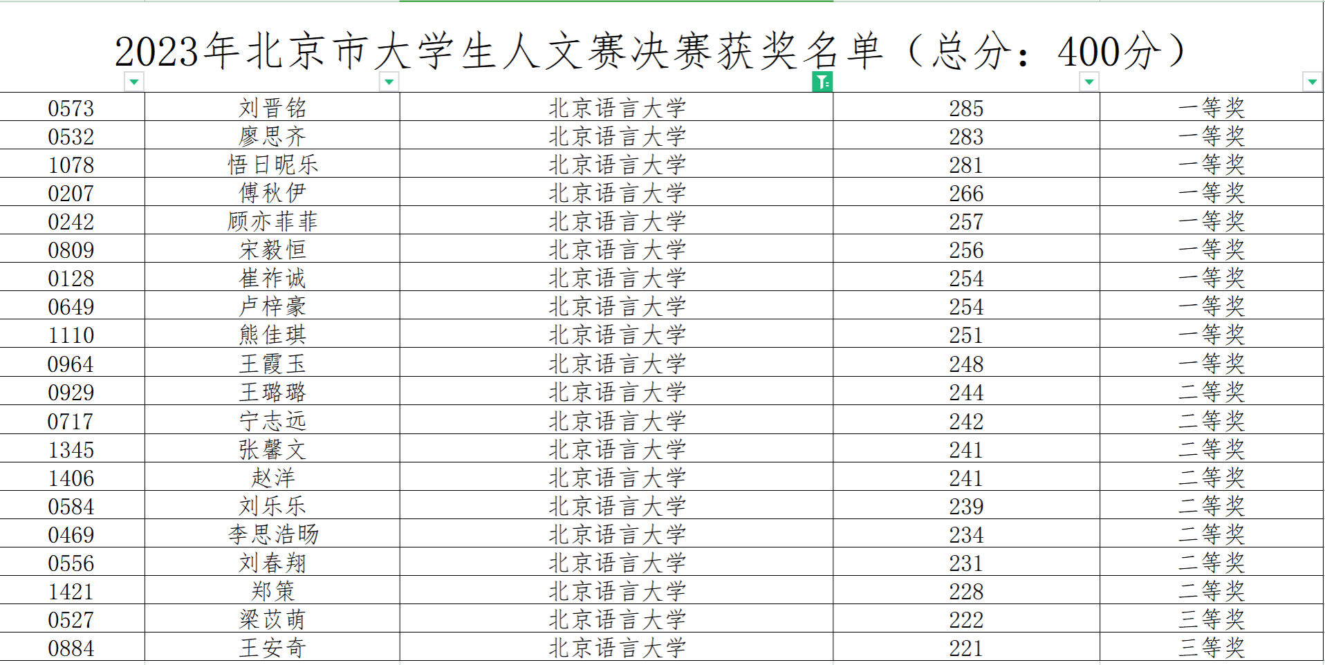 近日,北京市大学生人文知识竞赛决赛综合成绩获奖名单公示,北京语言大学共20名同学获得奖项,10名同学获得一等奖,8名同学获得二等奖,2名同学获得三等奖。其中,文学院共有14名同学获奖,2021级汉语言文学专业本科生刘晋铭、廖思齐作为北京赛区参赛代表参与华北五省(市、自治区)大学生人文知识竞赛。