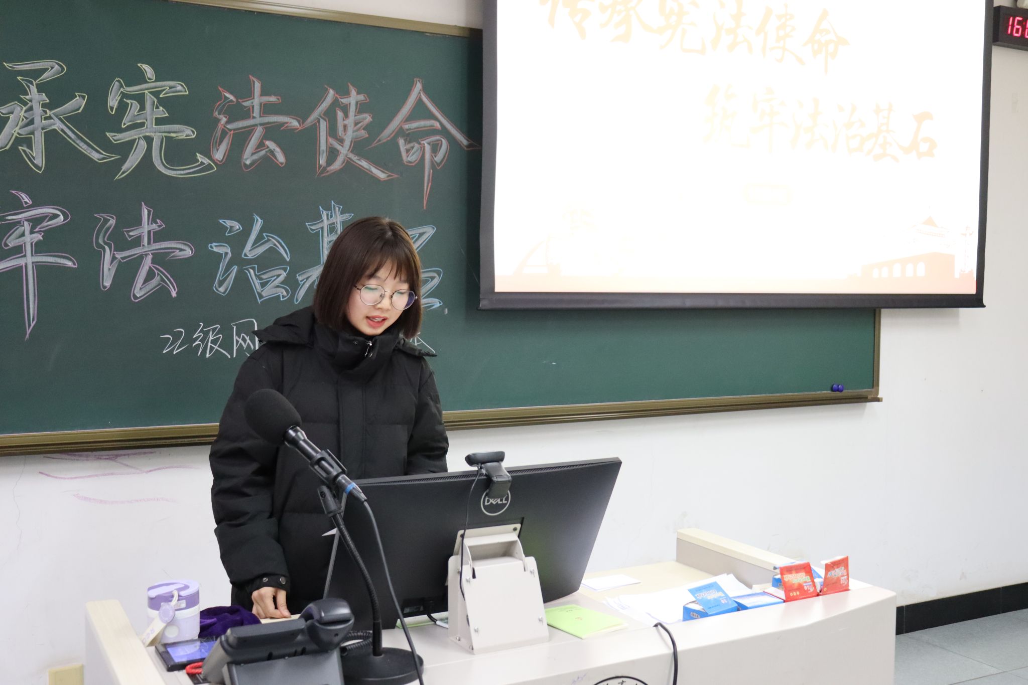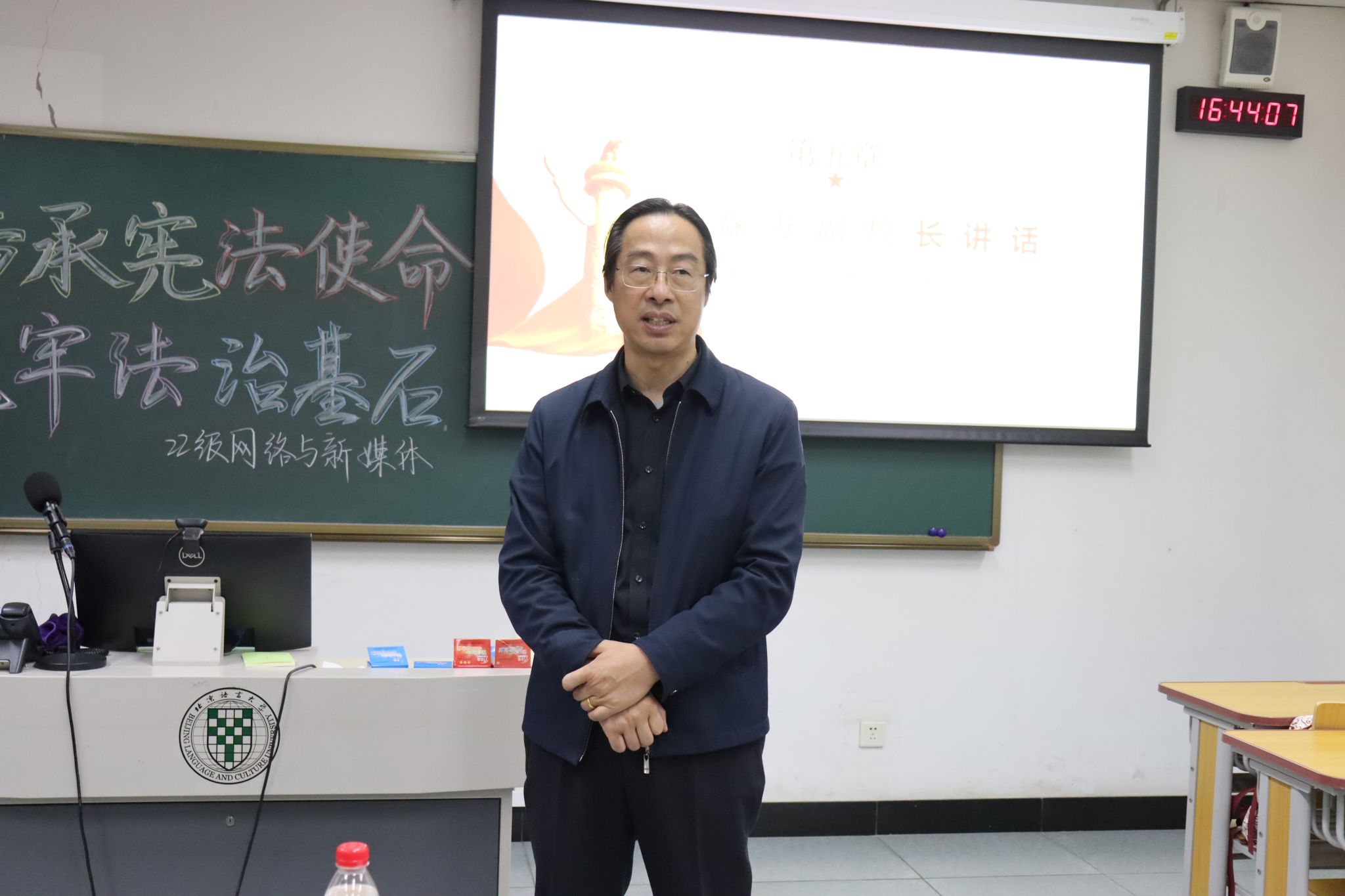 12月4日,2022级网络与新媒体班“传承宪法使命,筑牢法治基石”主题班会在教一312顺利举办。校党委常委、2022级网新班联系班主任黄益方副校长,新闻传播学院党总支书记杨天乔老师和新闻传播学院辅导员王一琳老师作为嘉宾参加班会,和同学们一起诵读宪法,学习宪法基本原则、主要内容。